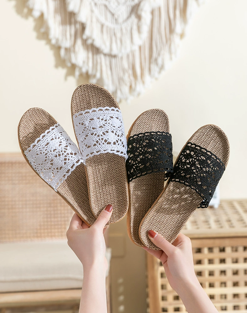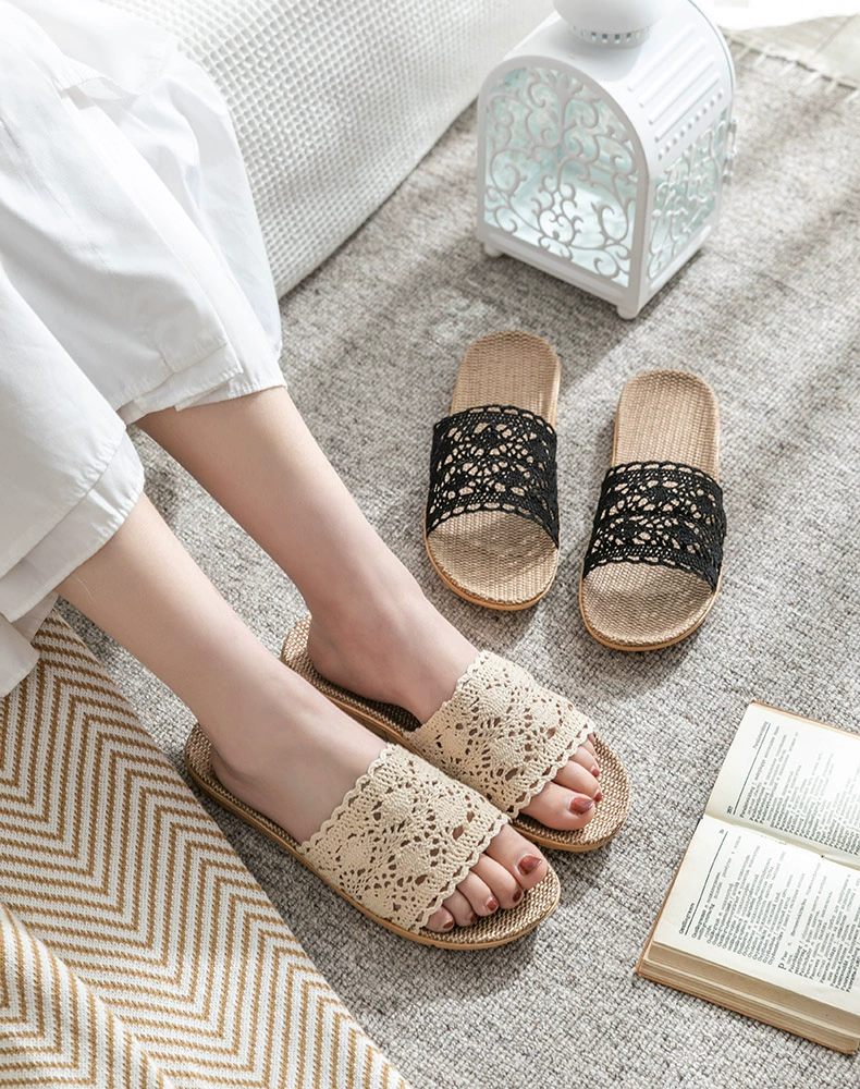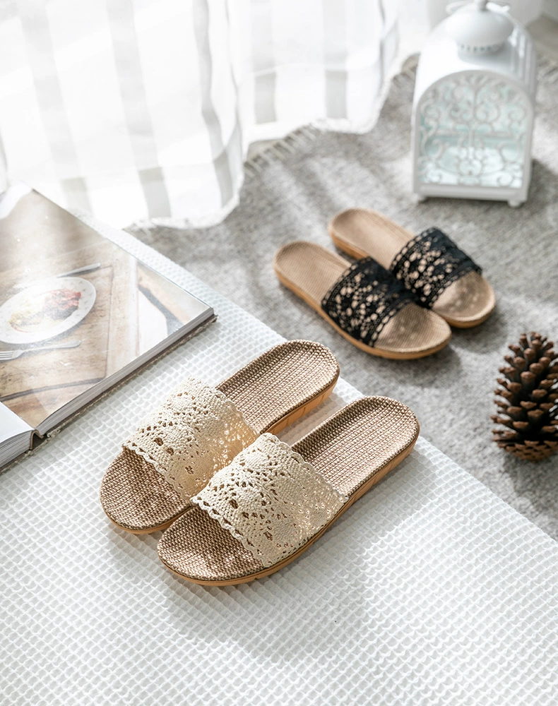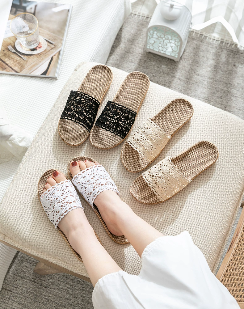 Шлепанцы женские домашние льняные, Нескользящие, с кружевом, деревянный пол, тихая Удобная удобная обувь для дома, сандалии для молодых девушек, летние