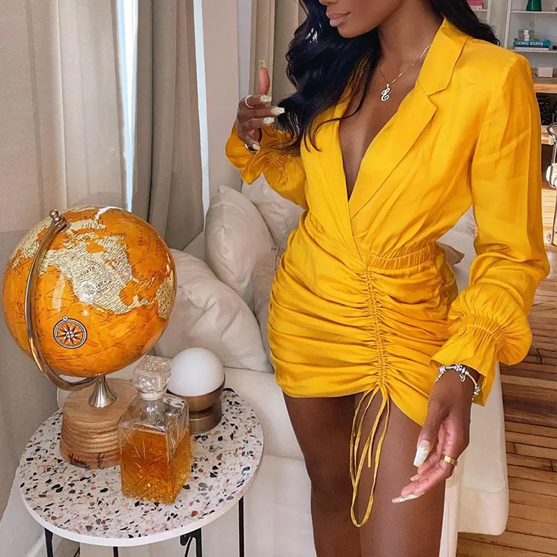 Женское облегающее мини-платье с длинным рукавом для ночного клуба вечерние, соблазнительные обтягивающие платья желтого и черного цвета с сумкой и плиссировкой на завязках, 2021