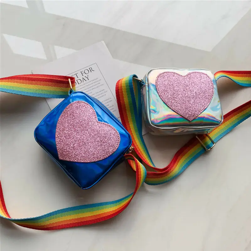 Детская сумка-мессенджер для девочек, регулируемый Радужный плечевой ремень из лакированной кожи с блестками и принтом в виде сердечек