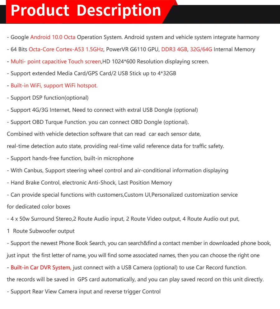 ФункцияСтатусЦенаЗуб попугаяОпционально (FC6000T)$40CarPlayОпционально (встроенный)$20CarPlay + Android AutoОпционально (встроенный)$30Сеть 4GОпционально (встроенный)Встроенный 4G поддерживает только европейскую версию, и клиенту необходимо предоставить частоту и информацию о операторе, специальную настройку. Внешний 4G ключ также совместим$55ISDB-T (полный комплект)Опционально (встроенный)$45TPMSОпционально (внешний)$80Коробка для DABДополнительно (SHINWA DB-MF03)$42БДОпционально (внешний)$10ВидеорегистраторДополнительная (внешняя) USB камера$30Вид сзадиУниверсальный подарок для камеры заднего вида(Если нужна специальная камера в номерной знак светильник $15)$15DVB-T(MPEG4)Опционально (встроенный)$55DVB-T2Опционально (встроенный)$77Нажмите, чтобы купить☝