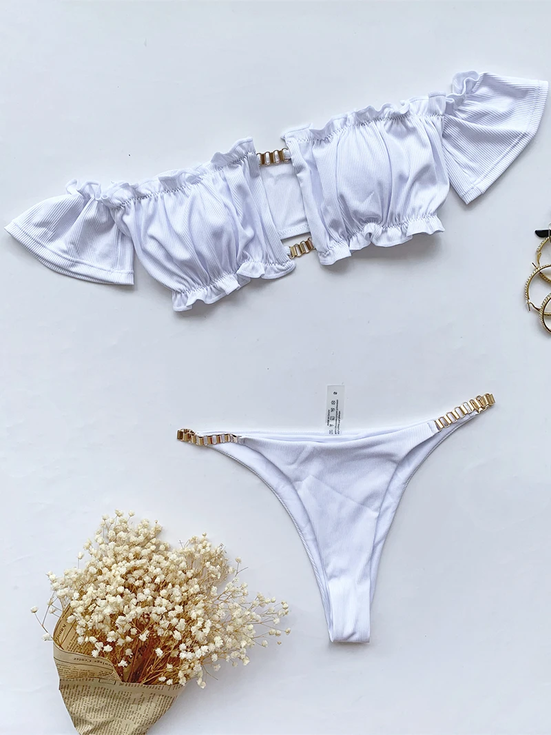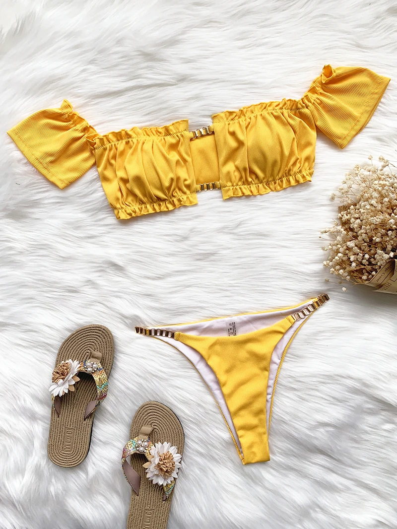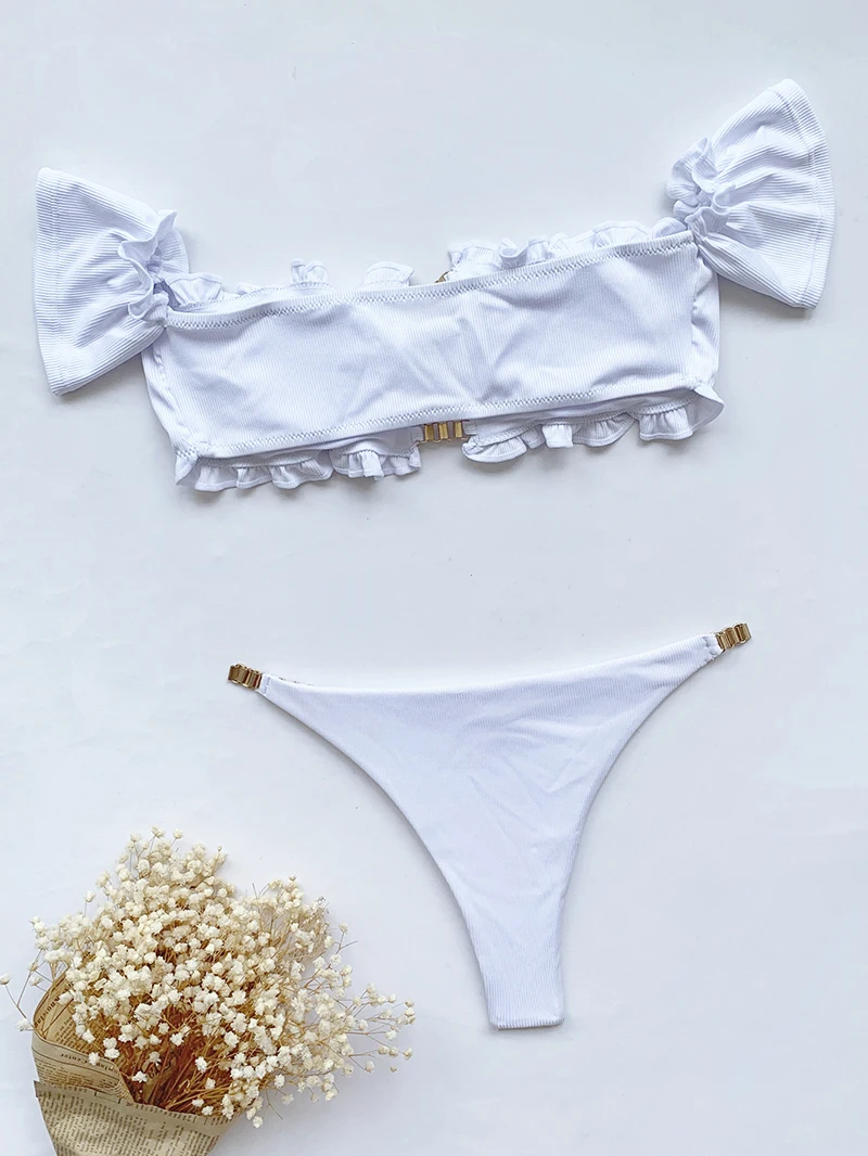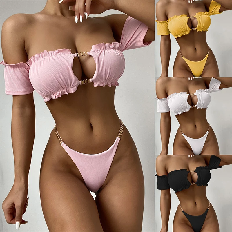 Бикини бандо с металлической пряжкой, однотонный раздельный купальник, женский купальник без бретелек, пляжная одежда с коротким рукавом, бикини с высокой талией 2022