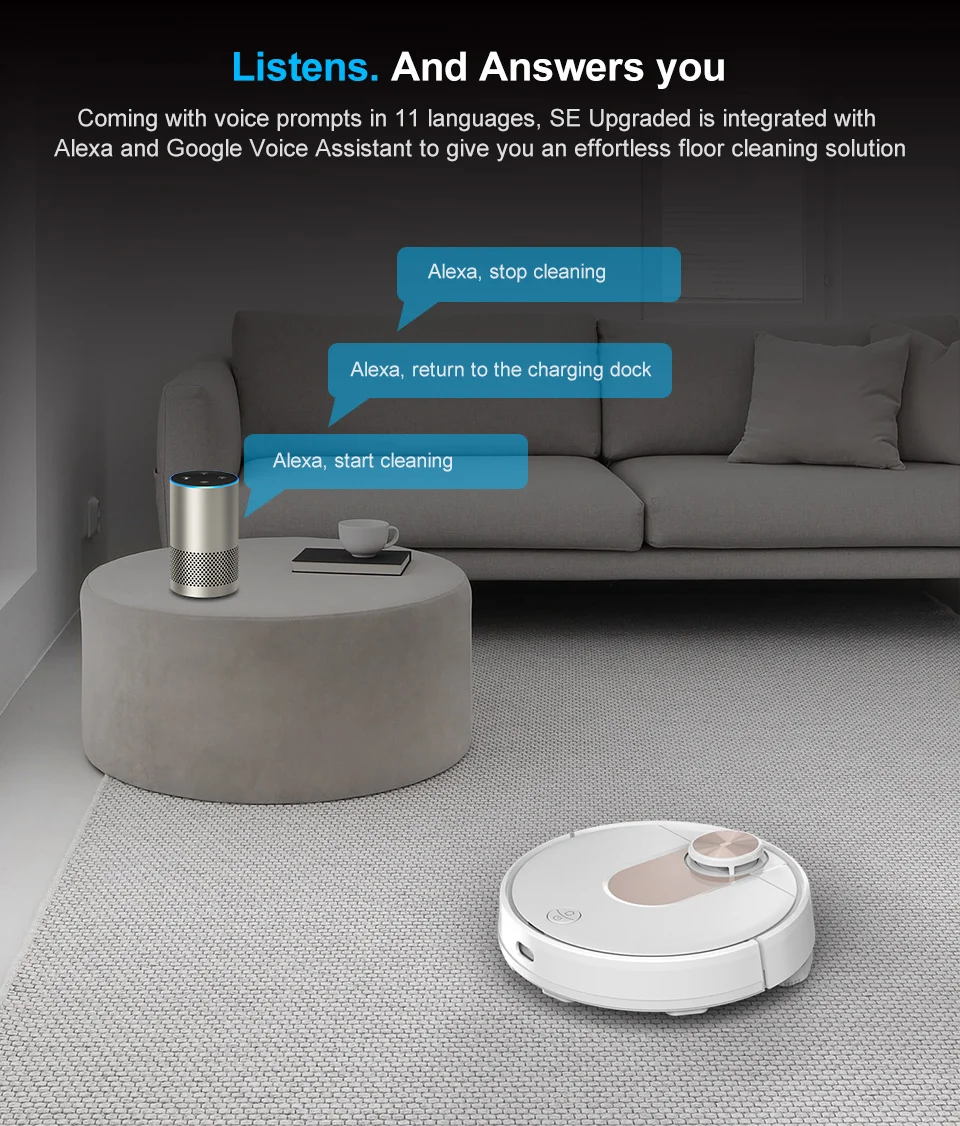 С голосовыми подсказками на 11 языках, SE Upgraded интегрирован с Alexa и Google голосовым помощником, чтобы дать вам легкое решение для очистки пола