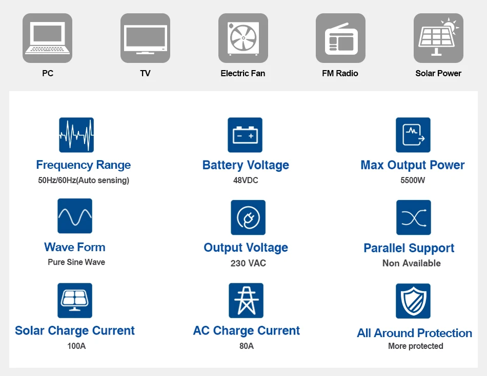 Примечание:5.5KW с WIFI содержит WIFI модуль,Если вам не нужен WiFi, пожалуйста, купите инвертор без WiFi Модуля