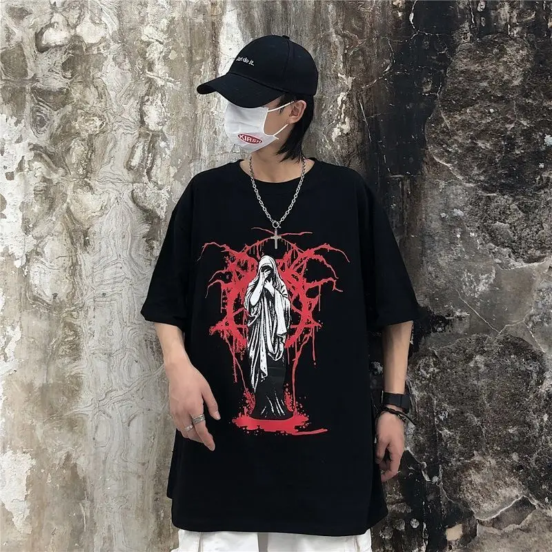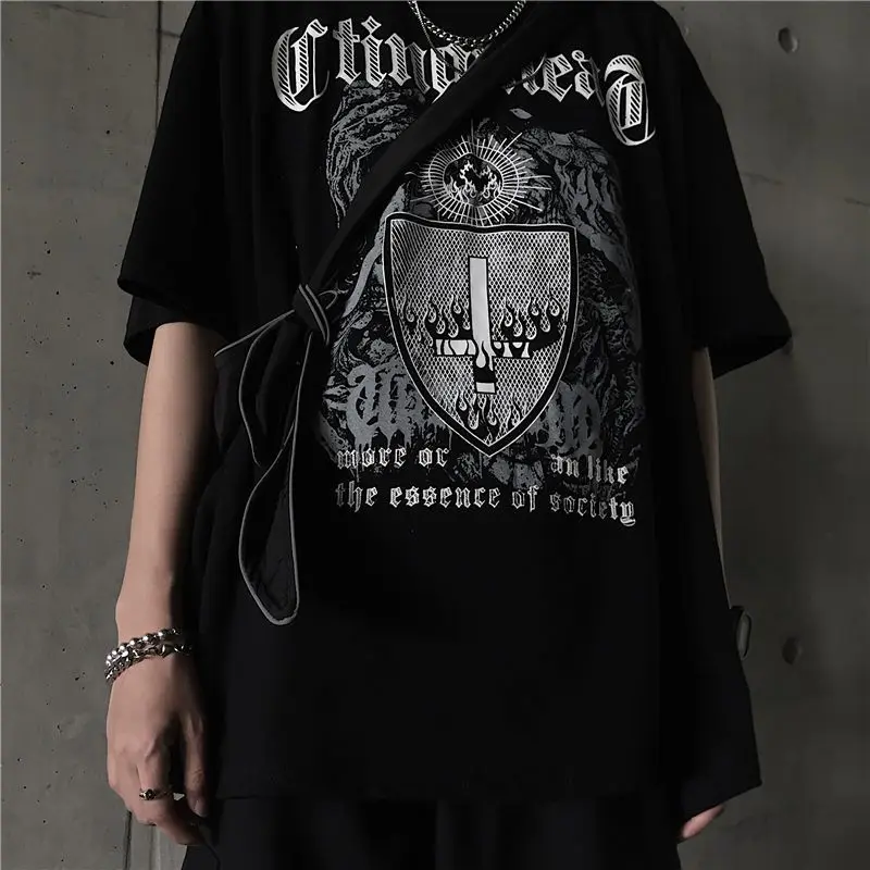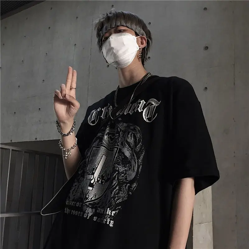 Мужская футболка с коротким рукавом и принтом букв, Новинка лета 2021, корейская мода, темный винтажный топ свободного покроя в стиле хип-хоп с перекрестными рукавами, тренд