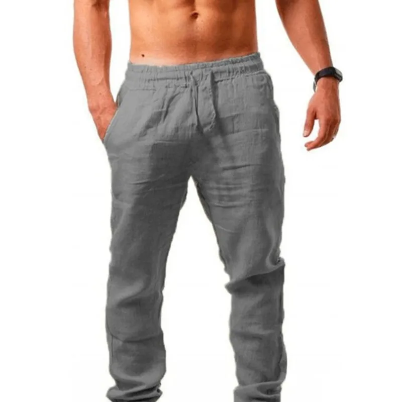 Мужские хлопковые льняные брюки, однотонные дышащие брюки для фитне...