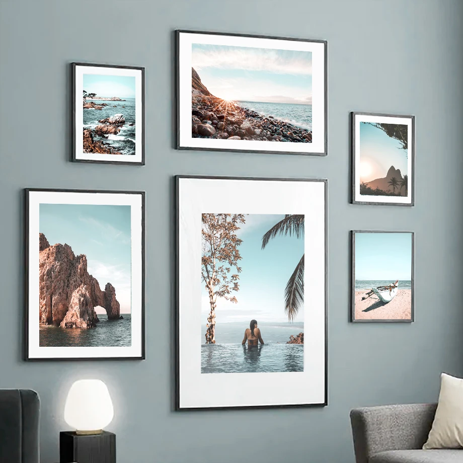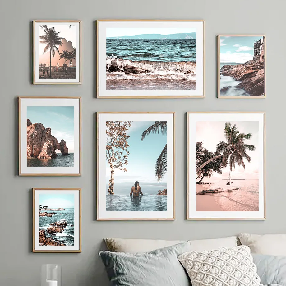 Пальмовое дерево пляж; Морские волны Чайка указатель Wall Art Холст...
