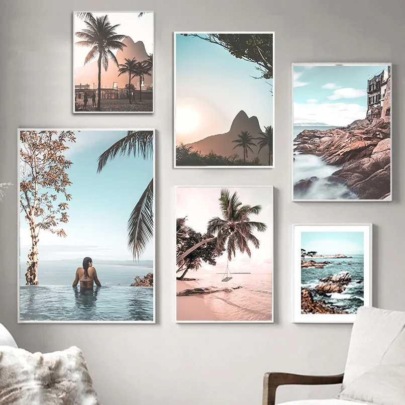 Прибрежном городе море пляж цветок пальмовых листьев Wall Art Холст...