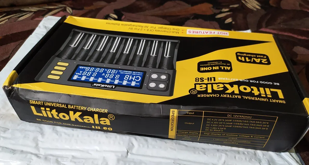 Входное напряжение: 12 В/4 а постоянного токаВыход напряжение: DC 4,2 V/1,48 V DC/DC 3,65 V / DC 4,35 V / 9VВыходной ток литиевая батарея зарядный ток: 2000ма * 4 / (300мА/500мА/700мА/1000мА) * 8 NiMH батареяЗарядный ток никель-металл: 500mA * 8 9В батареиЗарядный ток: 85 мА * 2 Аккумуляторная Батарея Характеристики: 26650,21700,18650,18350, 20650,14500, AA, AAA, C,SC 9V и т. Д. Метод прерывания: Интеллектуальный контроль напряжения Размеры: 195 мм (длина) * 142 мм (ширина) * 35 мм (высота).