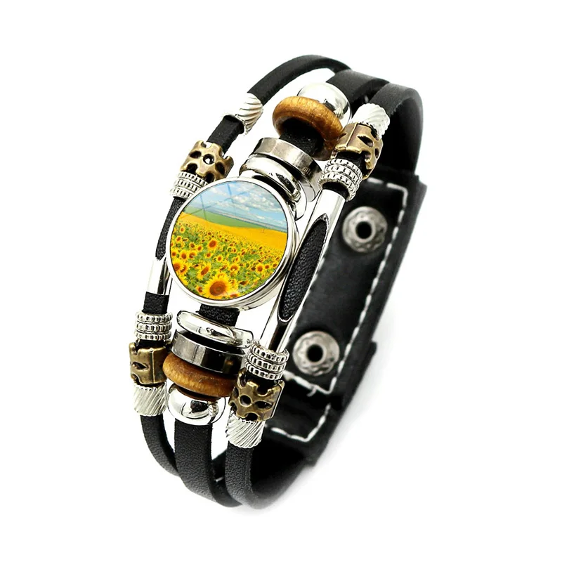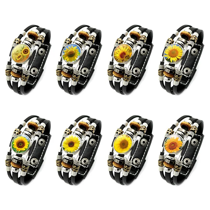 Браслет с подсолнухами для мужчин и женщин, многослойный кожаный браслет ручной работы с бусинами и кнопками-шармами