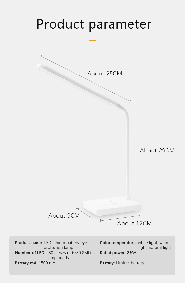 Подсказка: Пожалуйста, используйте мобильный телефон зарядное устройство или внешний аккумулятор с выходным напряжением 5 В и выходным током 1 А. Если выходной ток слишком большой или используется неправильное стандартное зарядное устройство 1A, это вызовет недостаточную яркость и повредит лампу. Новая перезаряжаемая настольная лампа для защиты глаз Спецификация: Цветовая температура продукта: 3000-6000K Светильник яркость: свободная регулировка Метод управления: трехуровневый сенсорный затемняющий белый светильник, теплый естественный светильник Спецификация батареи: литиевая батарея 18650 3,7 v 1500mA Номинальная мощность: 2,5 W Кол-во светодиодный свет: 30 шт. 5730 SMD лампы бусины Светильник источник света: светодиодный Материал тени: пластик Режим переключения: сенсорный Стиль: Современный и простой Режим питания: Встроенный литиевый аккумулятор Подключаемая Модель: необходимо всегда использовать usb для зарядки, без аккумулятора Особенности: 1. Цветовая температура длительной работы или места чтения и письма не должна превышать 4000K. 2. Долго нажимайте плавное затемнение, чтобы выбрать наиболее комфортный светильник для глаз. 3. Цвета объектов в области освещения становятся все более и более четкими, и человеческий взгляд выглядит комфортно и естественно. 4. Зарядка и подключение двойного назначения, узнайте во время зарядки.