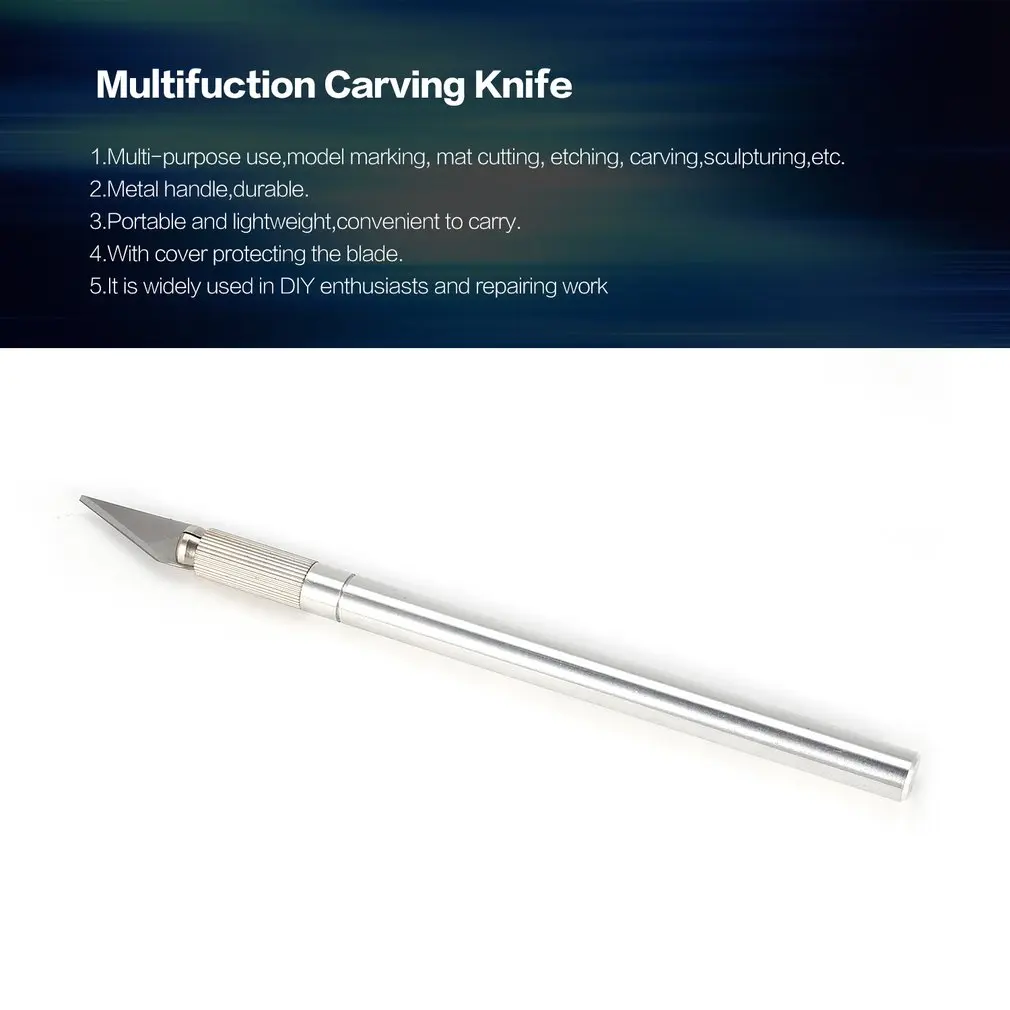 Особенности:1. Многоцелевое использование, Маркировка Модели, резка ковриков, травление, резьба, скульптура и т. д.2. Металлическая ручка, прочная.3. Портативный и легкий, удобно носить с собой.4. С крышкой, защищающей лезвие.5. Он широко используется в DIY энтузиастов и ремонтных работ.