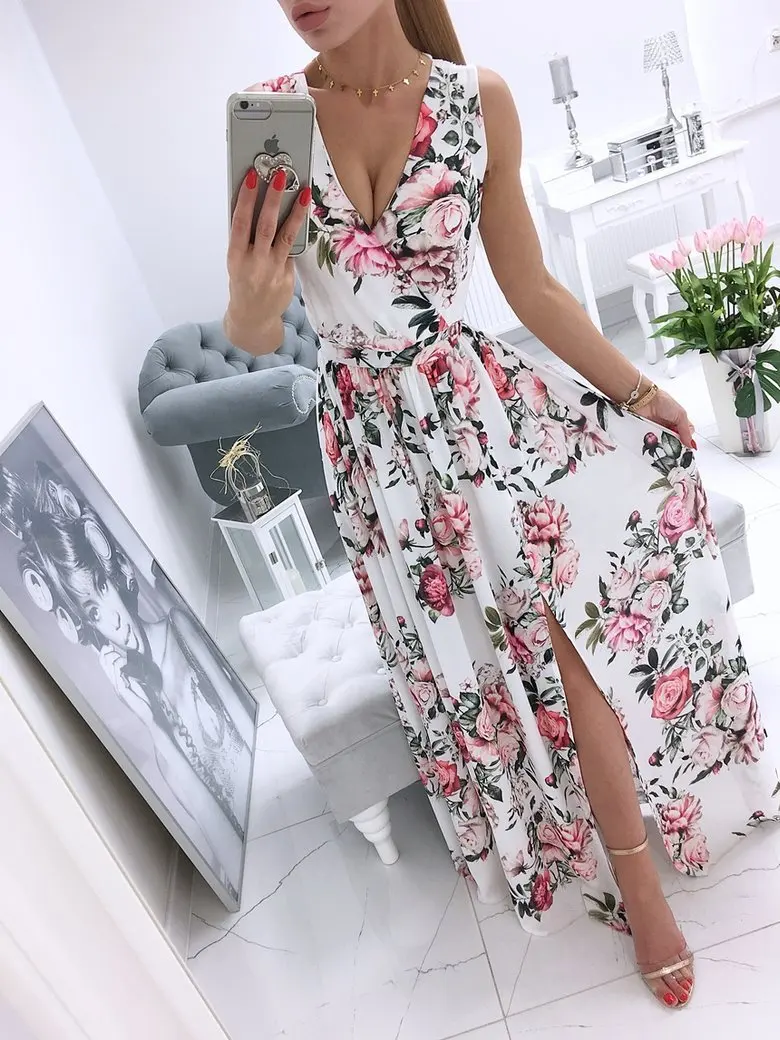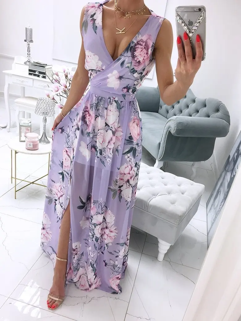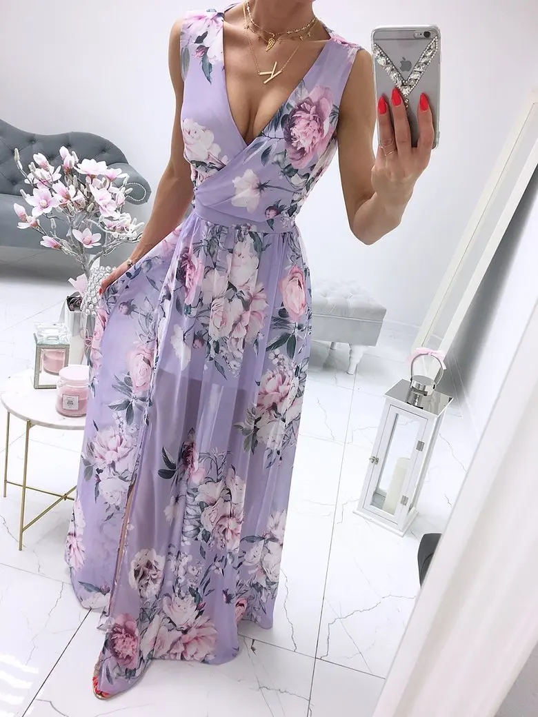 Женское пляжное платье макси, элегантное шифоновое вечернее платье без рукавов, с V-образным вырезом, винтажное длинное платье с цветочным принтом, для лета