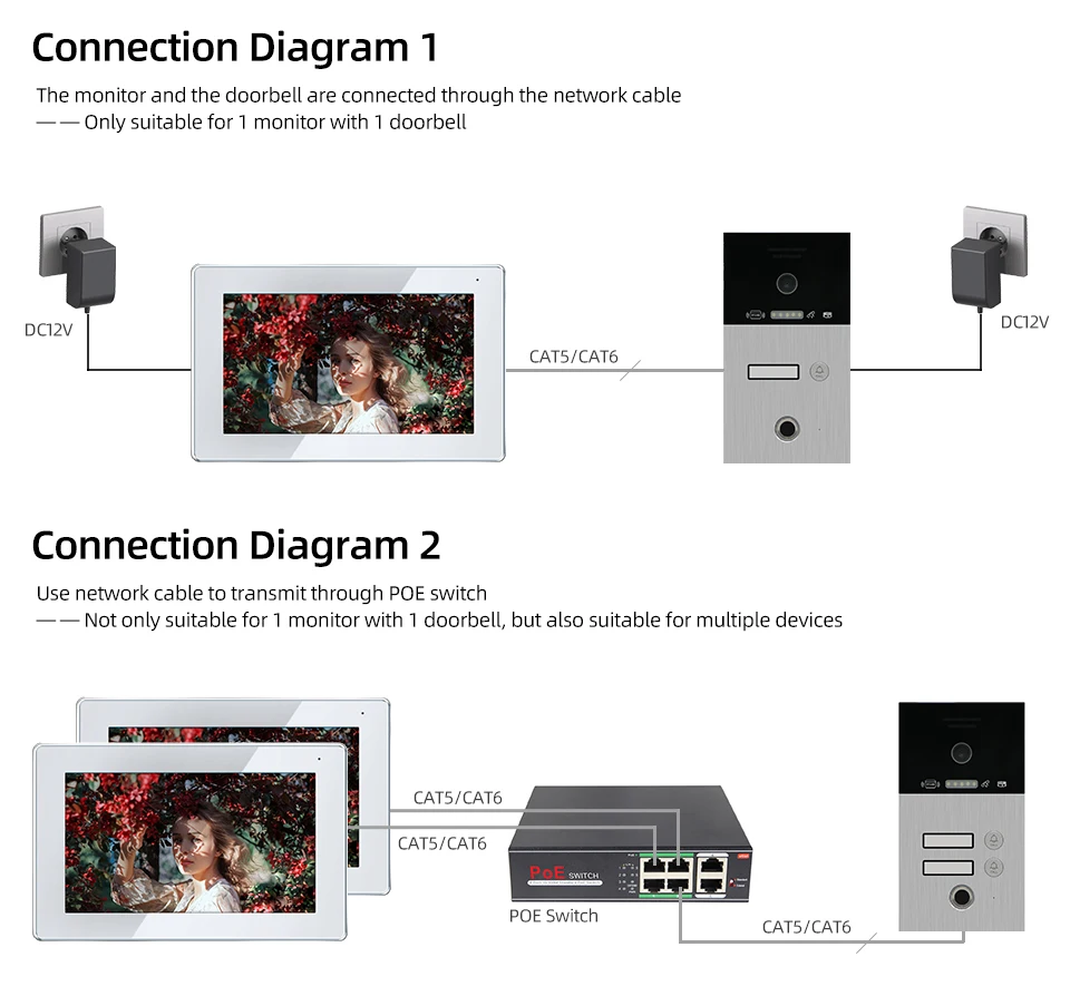 1. Может быть подключен к нескольким комнатным мониторам. Вы можете установить столько устройств, сколько хотите в доме (с POE-переключателем).2. Поддержка одного наружного блока с несколькими внутренними блоками.3. Оцифровка, просто подключите внутренний блок с сетевым кабелем.