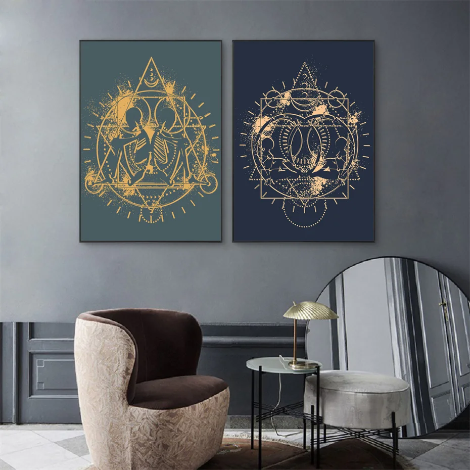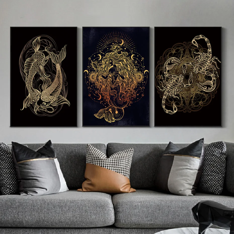 Черного и золотого цвета линии ход Sun Moon Gecko Koi красивый узор декоративная живопись постер картина Тотем Спальня домашний декор