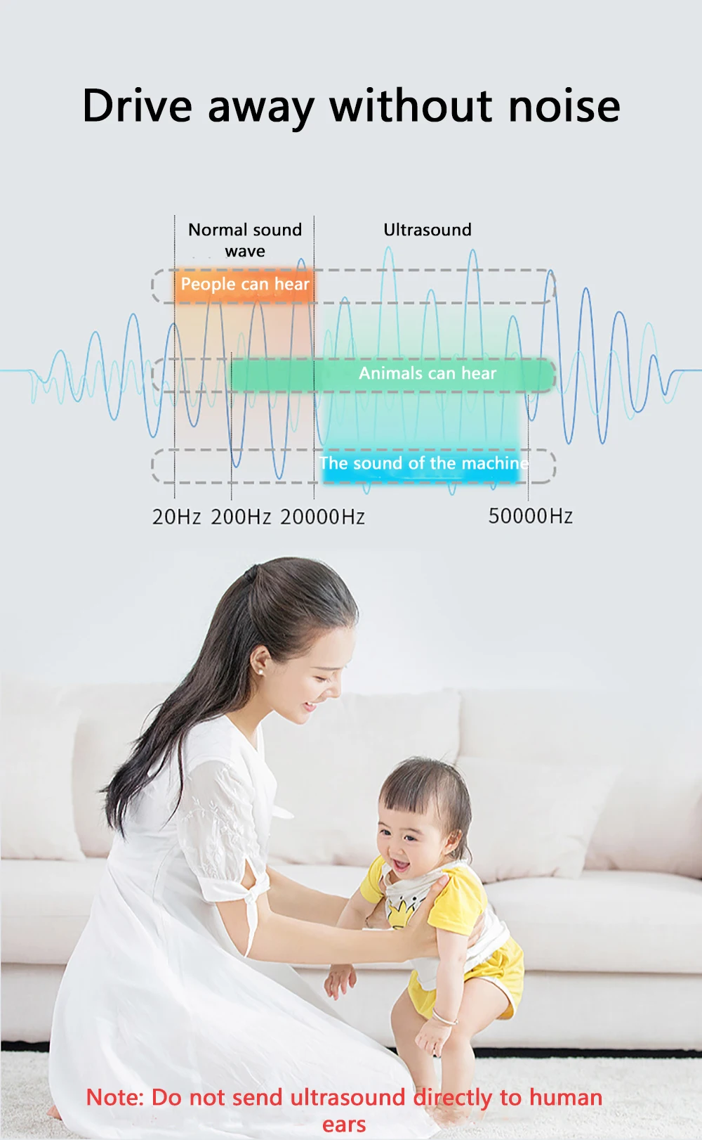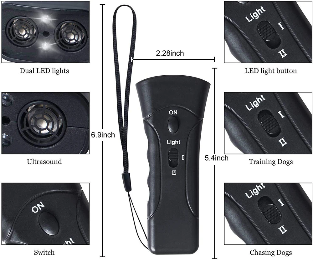 Простота в эксплуатации: сначала откройте крышку аккумулятора, а затем вставьте 1 батарею на 9 В (не входит в комплект), звук слышно только домашним животным, наконец Включите переключатель, и он может хорошо работать, а также служить фонариком при необходимости.