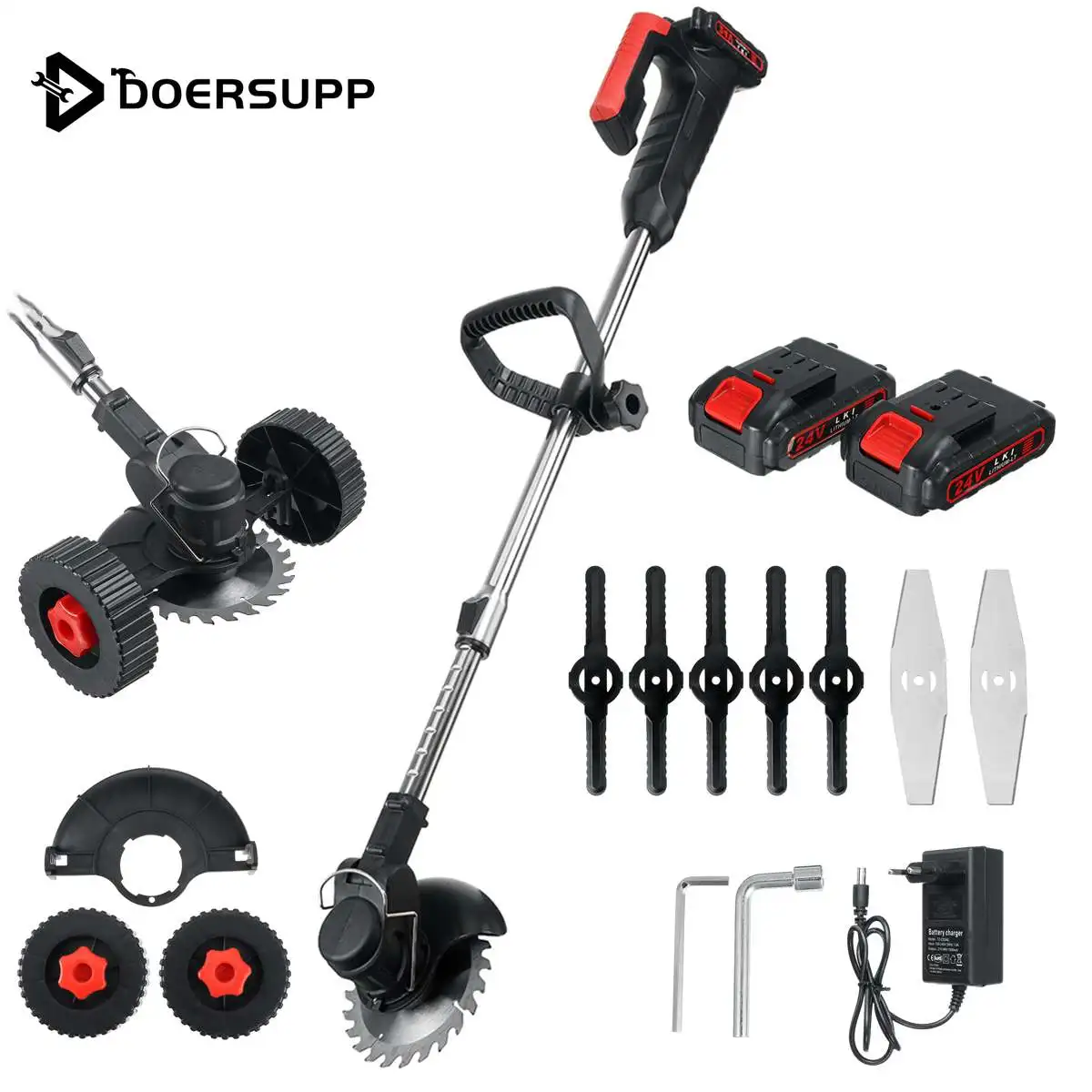Спецификация:-Цвет: зеленый, черный-Тип (опция): триммер для травы, колеса шасси-Вилка (опция): вилка ЕС, вилка США-Количество батарей (опция): 1 шт., 2 шт.-Напряжение (опция): 21 в (зеленый), 24 В (черный)-Материал: инженерный пластик абс + алюминий + сталь-Емкость аккумулятора: 8000 мАч-Время холостого хода: около 4 часов/6 часов-Время зарядки: 1 час-Скорость холостого хода: min-25000r об/мин (макс.)Посылка
