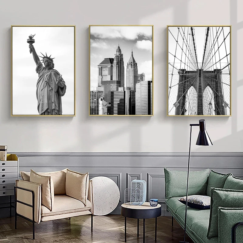Статуя Свободы Нью-Йорка пейзаж города черно-белый изображение на стене иллюстрация постер художественное украшение живопись