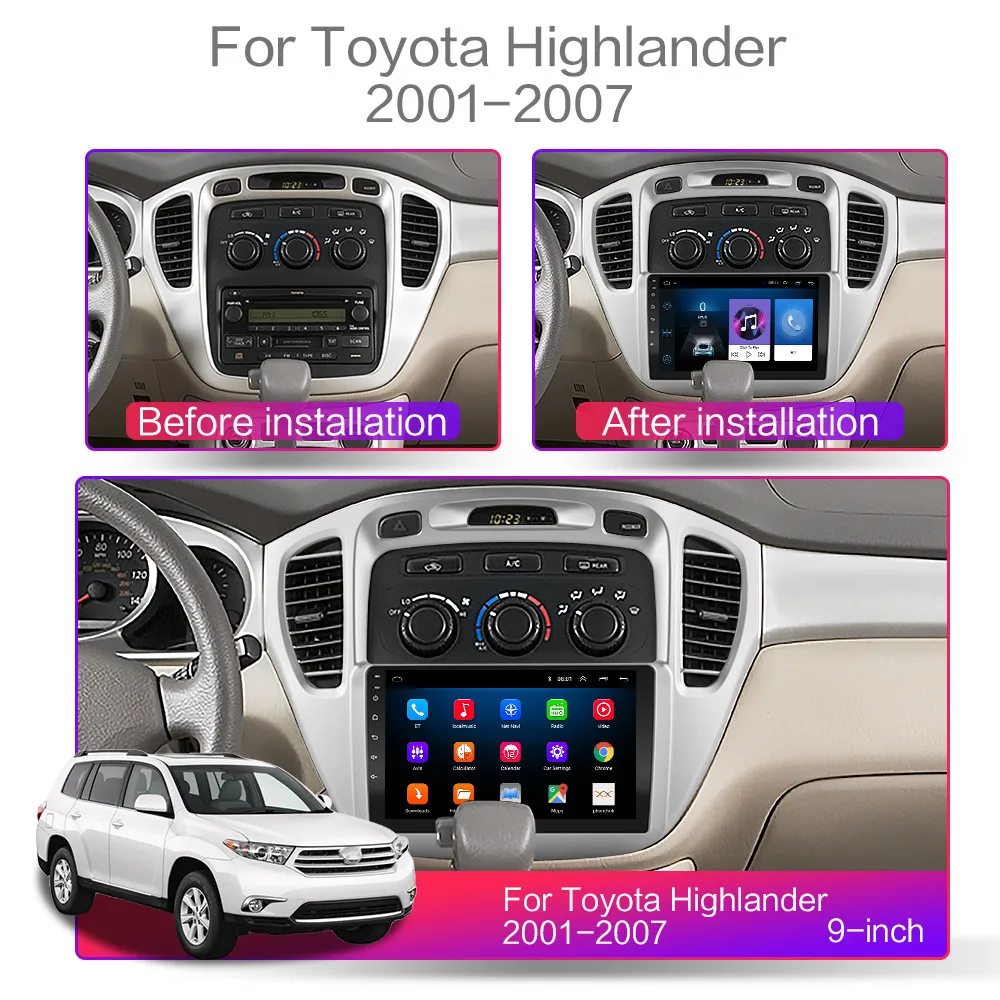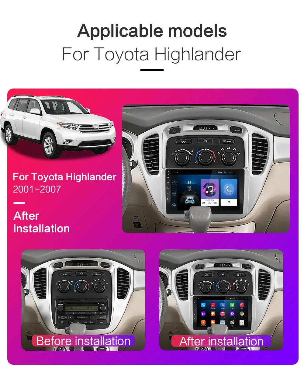 Для Toyota Highlander 2001 2002 2003 2004 2005 2006 20071. Операционная система Android может установить приложение Google Play store Skype Facebook youTube Twitter и т. Д.2, 4-х ядерный конфигурация включает в себя (Оперативная память + Встроенная память): 1 Гб + 16 ГБ/2 ГБ + 16 ГБ/2G + 32G [дополнительно]3, 8-ядерный конфигурация включает в себя (Оперативная память + Встроенная память): 7216-1 г + 32 г/7216-2 г + 32 г/7216-4 г + 64 г/7216-6 г + 128 г/7216-8 г + 128 г/4G-SIM-5716-2G + 32G/4G-SIM-5716-4G + 64G/4G-SIM-5716-6G + 128G/4G-SIM-5716-8G + 128G [опционально]4, 4-ядерный содержит: версия: Android 9,0Разрешение: HD TN; 1024*600; Не поддерживает функцию AM и RDS;5, 8-ядерный содержит: версия: Android 10;Разрешение: HD IPS,7216-WIFI версия: поддержка s DSP, FM, RDS ,16EQ, HIFI, сплит-экран, поддержка внешней carplay, фронтальной и задней двойной записи и 360 панорамных функций камеры; не поддерживает видеовыход;4G-SIM-5716-WIFI версия: 8-ядерный, Поддержка s DSP, FM, RDS, Hi-Fi, Разделение экран, Поддержка к внешним carplay, спереди и сзади двойная запись и 360 панорамная камера функций; не поддерживает видеовыход;6. Поддержка: радиостанция, Bluetooth Вызов, Bluetooth музыка, управление рулевым колесом, встроенный WiFi, MP3, видео музыка (MPG, AVI), навигация, видеовыход, зеркальная связь, USB 4G LTE WIFI ключ и другие функции; Поддержка выбора логотипа автомобиля; Sfactory пароль: 8888