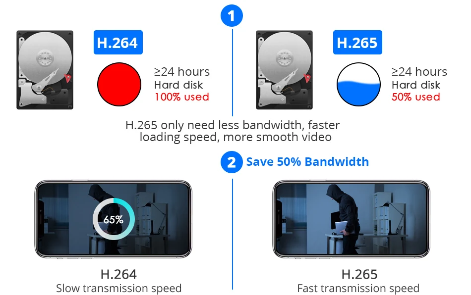 H.265 PTZ камеры наблюдения с WiFiH.265 удваивает эффективность кодирования по сравнению с его предыдущей H.264. Это означает, что H.265 + видео экономит около 50% битов при том же качестве кодирования