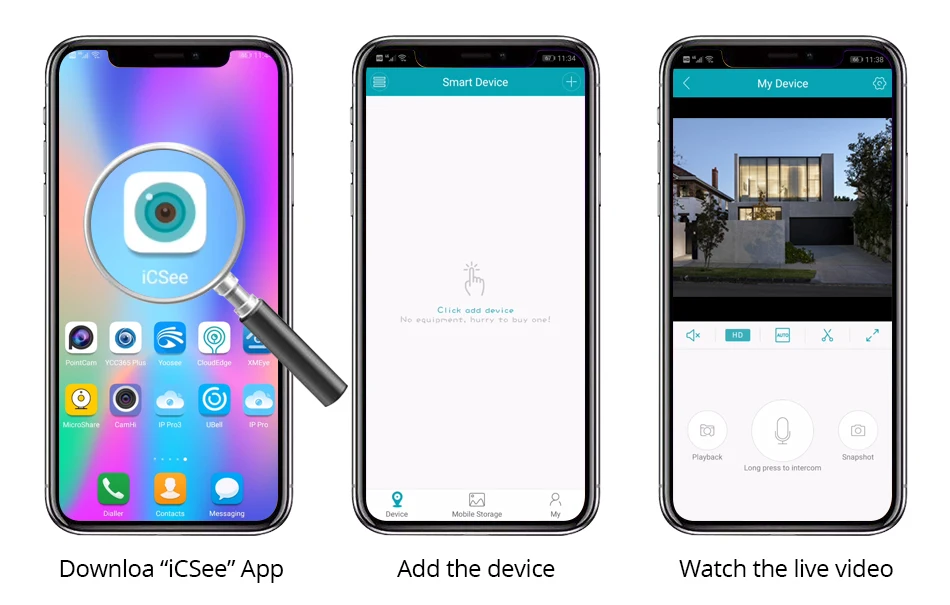 P2P, удаленный мониторинг в любое время в любом местеЗагрузите бесплатное приложение «ICSee» на свой смартфон (iOS или Android) и наслаждайтесь одновременным просмотром четырех камер в приложении. Вы можете просмотреть видео в реальном времени в приложении iCSee или XMEYE