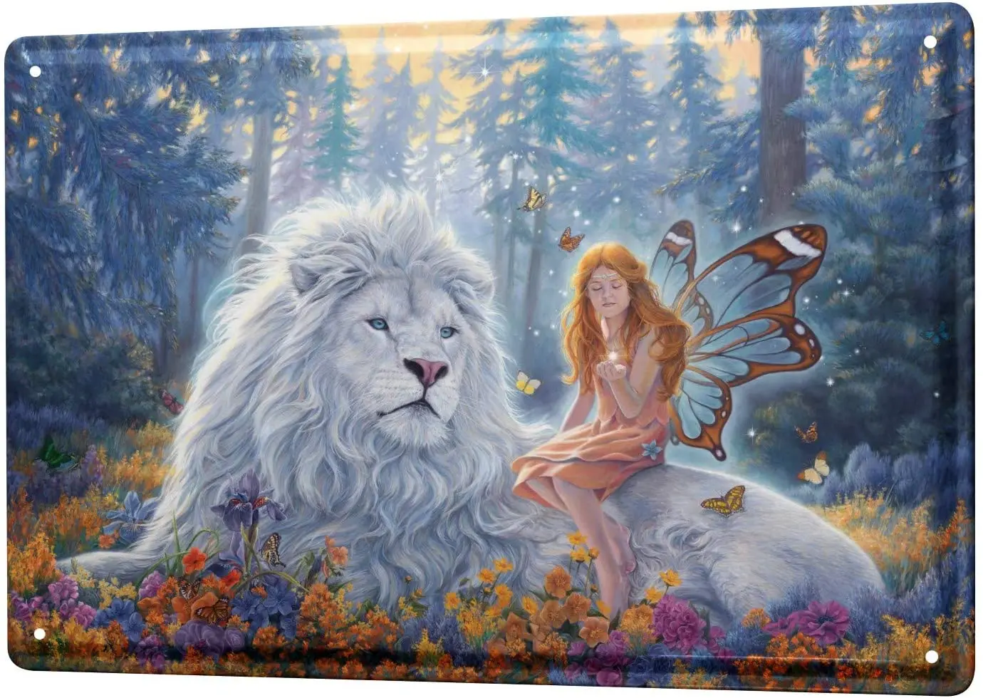 Жестяная металлическая пластина, декоративный знак, таблички для домашнего декора, 30x40 см, фантазийный мотив, белый лев с эльфом