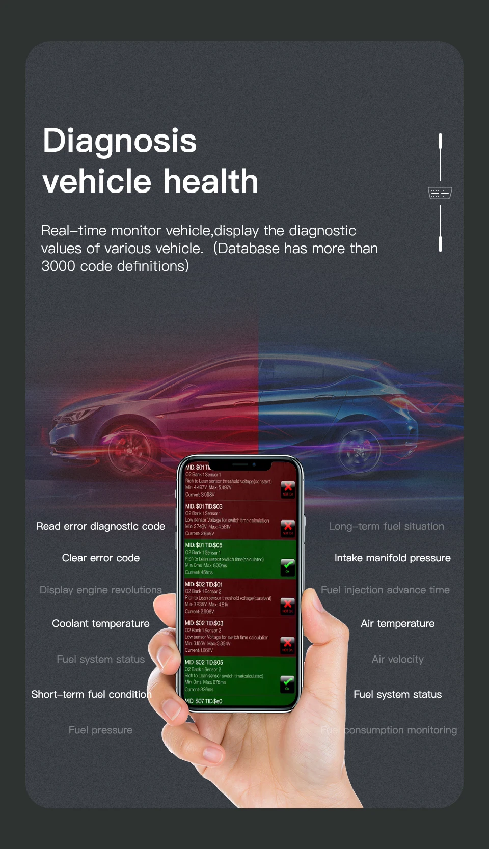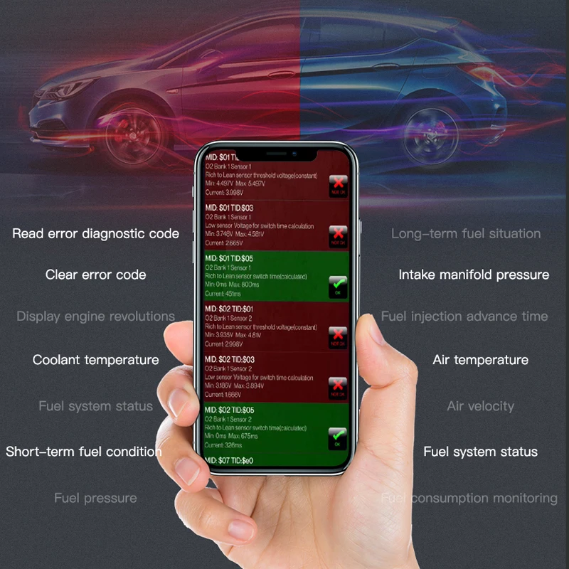 Прочитайте коды диагностики ошибок-общие и конкретные от производителя, и Отобразите их значение (база данных содержит более 3000 общих кодов)