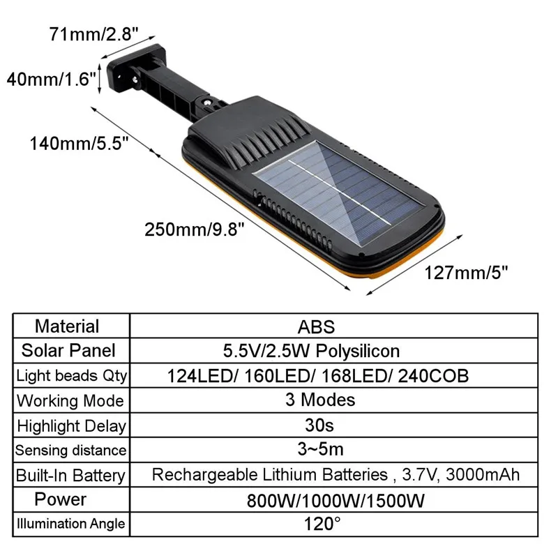 Спецификация стиля -- Солнечный индукционный настенный светильник-Солнечная панель: 5,5 V/2,5 Вт солнечная панель-Аккумулятор: 3000 мАч-Светодиоды: 168LED/240COB белый светильник-Мощность: 15 Вт-Расстояние срабатывания: 3-5 мКласс водонепроницаемости: IP65-- Место использования: Семейный двор, вилла коридор, сад бассейн, дорожное освещение Три режима работы: 1. Автоматически включается, когда человек приходит, человек выходит из лампы. 2. Светильник становится на 100% яркостью, когда человек приходит, 50% яркости, когда человек покидает свет. 3. Автоматическое включение в темноте, автоматическое выключение в дневное время.