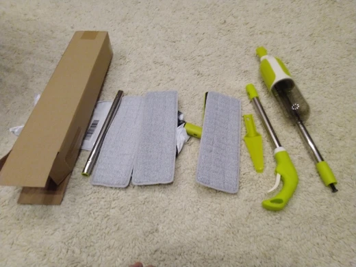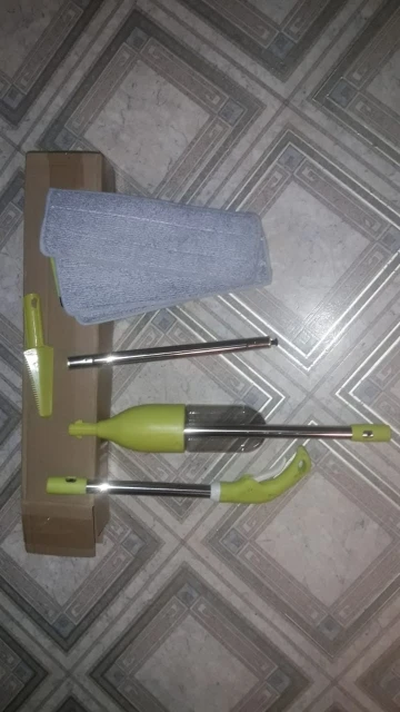 Швабра классная, главное при сборке собрать именно так, как на фото. Изначально собрала не правильно и распылитель не работал. В комплекте 3 насадки для мытья, практически не оставляют разводы. Привёз курьер домой, быстрая доставка.