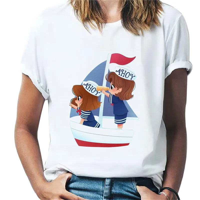 Для женщин Harajuku футболка с изображением якоря с мультяшным кото...