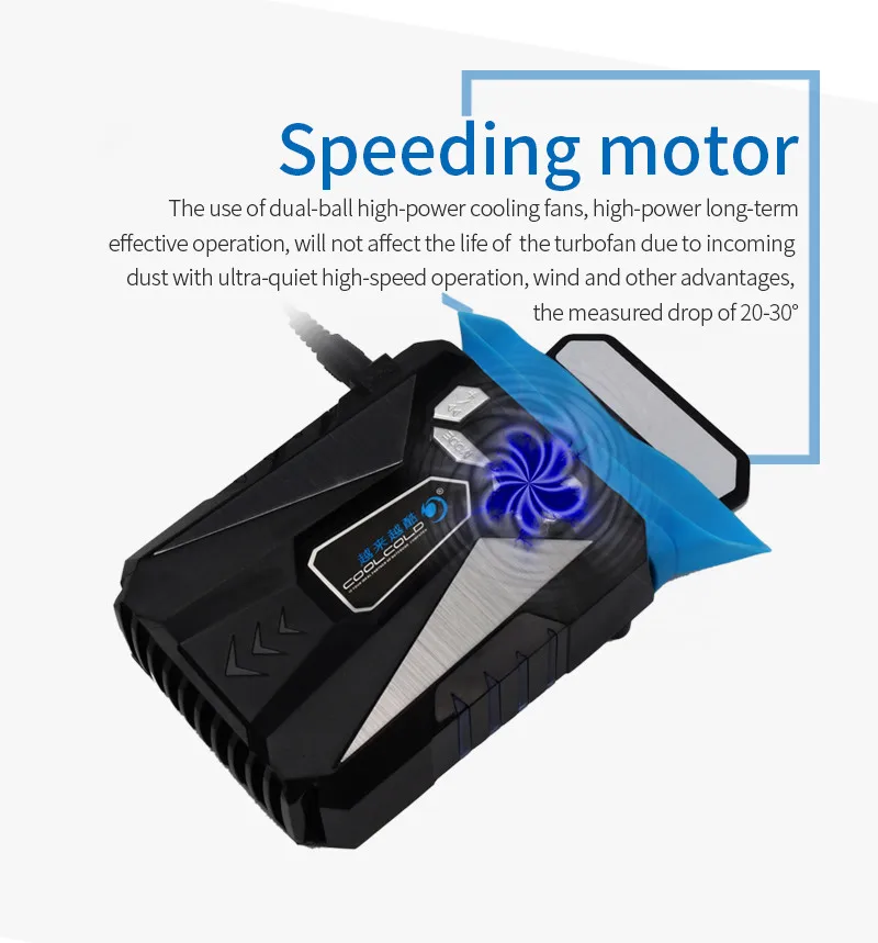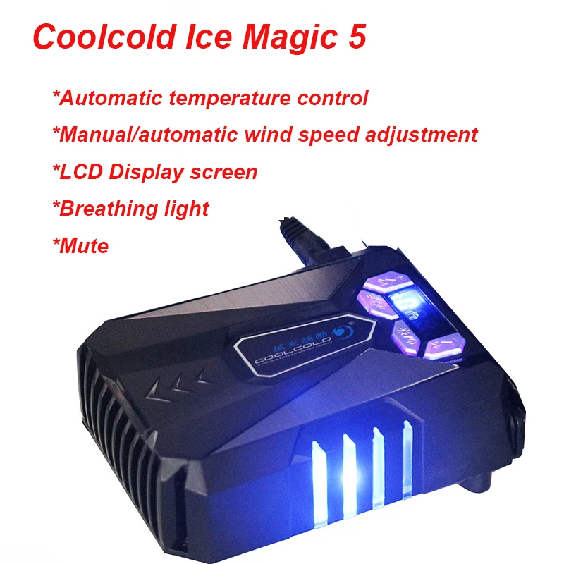 Особенности:1. Быстрое охлаждение, бесшумная работа, маленький и сильный2. Регулируемая скорость3. Дизайн продукта гуманизация: каждый радиатор оснащен 4 видами ветровых направляющих, чтобы справиться с любой розеткой ноутбука. Несколько ветровых направляющих могут быть совместимы с рынком различных портативных компьютеров с теплоотводом, потребителям не нужно беспокоиться о том, что радиатор не совместим, не соответствует.Есть 3 версии COOLCOLD laptop cooler, пожалуйста, подтвердите версию перед покупкой. Пожалуйста, свяжитесь со мной, если у вас есть какие-либо вопросы.Версия Ice Magic 5 Lightning* Охлаждение в ручном режиме и автоматическом режиме.* Очаровательный синий светильник, может быть открыт, может быть выключен, может быть переключен.* Многофункциональный Жидкокристаллический дисплей.Работа:* Замедление:Нажмите один раз, ручной режим активирован,Нажмите снова, Скорость начала уменьшаться.* Ускорение:Нажмите один раз, ручной режим активирован,Нажмите еще раз, скорость вращения вентилятора увеличивается.* Ручная/автоматическая:Кнопка переключения режимовНажмите один раз, ручной/автоматический переключатель режимаНажмите 2 секунды, переключение скорости/Отображение температуры* Декоративные огни:Кнопка включения питанияКороткое нажатие, декоративная лампа ВКЛ/ВЫКЛНажмите 2 секунды, выключите или загрузитеРазмер изделия: 155*82*40,5 ммРазмер вентилятора: 75*75*25 ммВес изделия: 250 гСкорость вращения вентилятора: 900-3500 + 10% об/минМаксимальный объем воздуха: 23.35CFMНоминальное напряжение: 5 ВНоминальный ток: 0,35 + 10%Вход мощность: 1,75 W