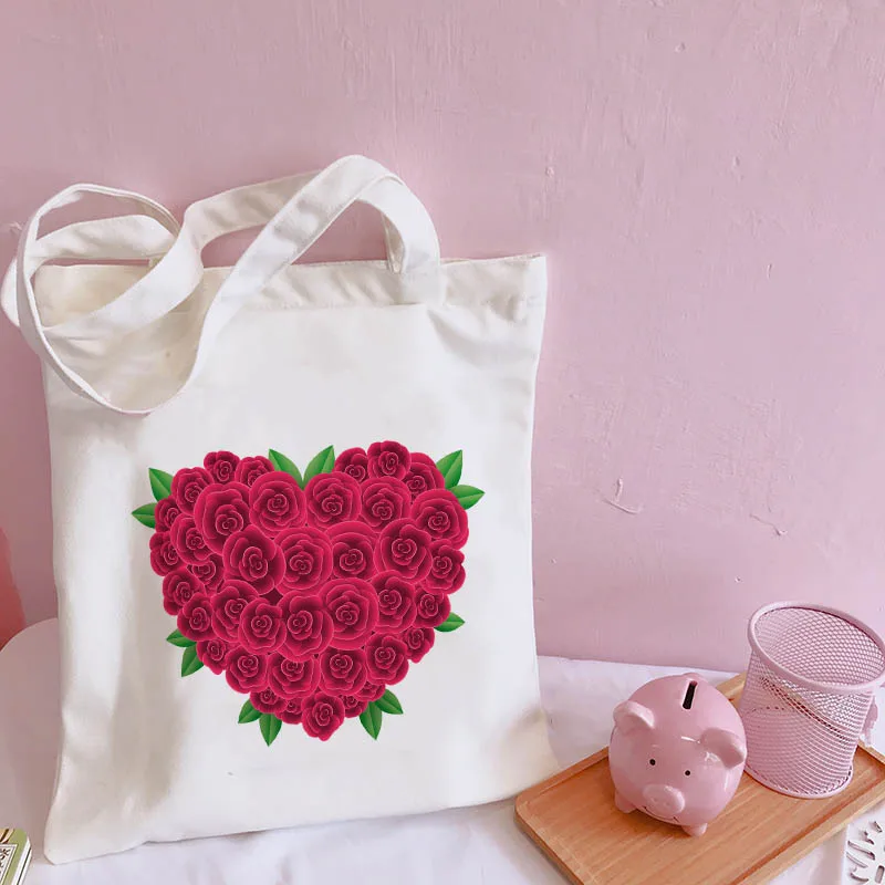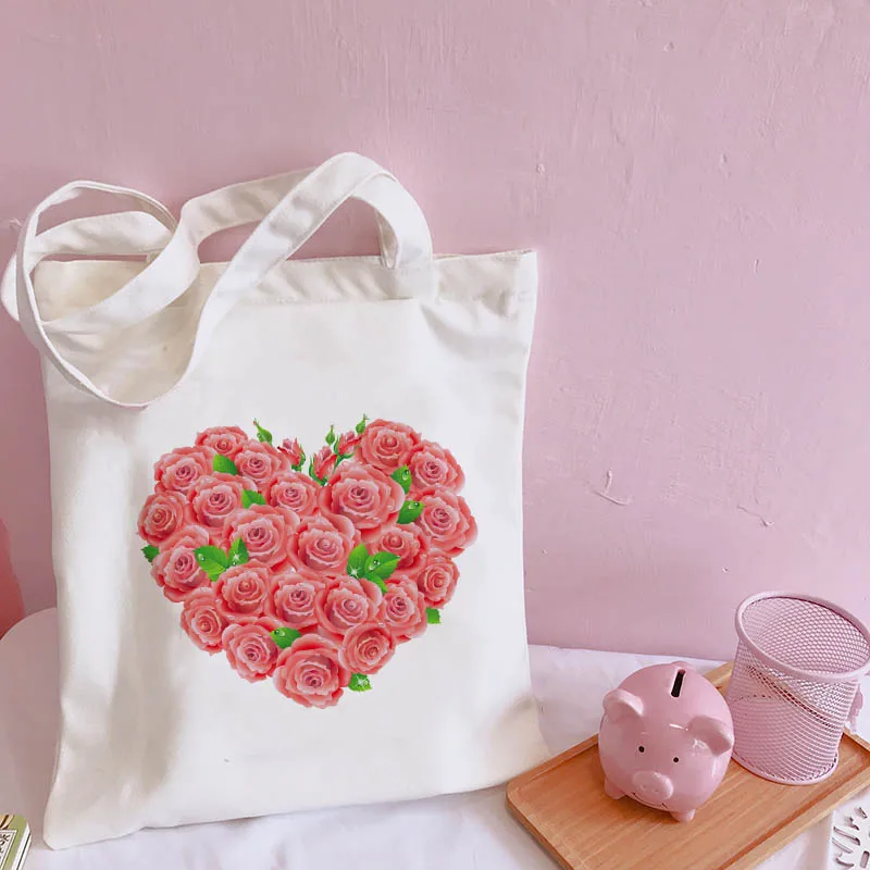 Холщовая женская сумка через плечо с розовым сердцем и цветочным принтом, экологически чистые многоразовые мешки для покупок для путешествий, подарок на день Святого Валентина