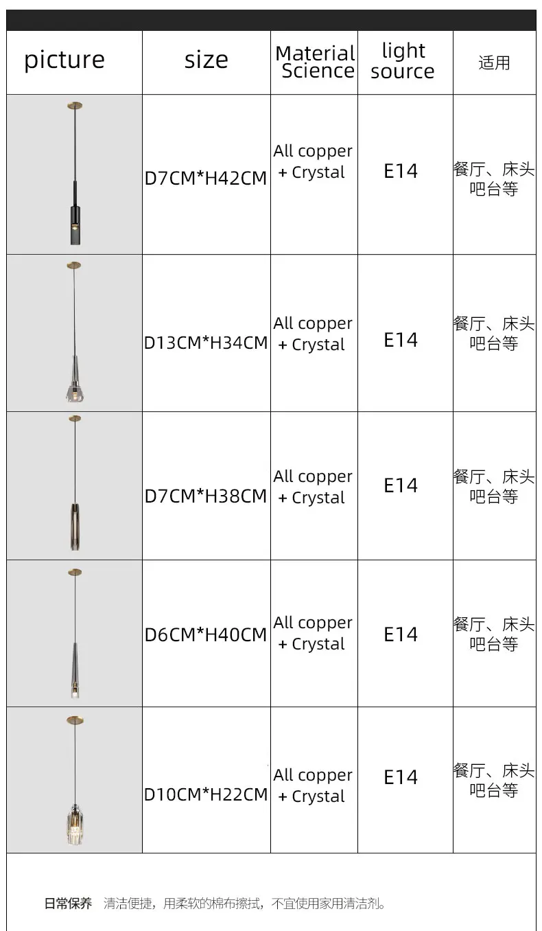 Цвет: прозрачныйСветильник источник: E14Светильник ing: белый светильник/Теплый светильникМатериал: медь + кристаллРазмеры: следующим образом:A: диаметр 7 см * 42 см, и общая длина лампа + линия 1,5 мB: диаметр 13 см * 34 см, и общая длина лампа + линия 1,5 мC: диаметр 7 см * 38 см, и общая длина лампа + линия 1,5 мD: диаметр составляет 6 см * 40 см, и общая длина лампа + линия 1,5 мE: диаметр составляет 10 см * 22 см, и общая длина лампа + линия 1,5 м(Пожалуйста, свяжитесь со службой поддержки клиентов, если линия Подвески должна быть больше)Напряжение: ac220в (Примечание: Пожалуйста, обратите внимание на различное напряжение и свяжитесь с нами!)Применение: гостиная, спальня, столовая, кухня, бар, кофейня, вилла, гостиница, кабинет, офис, студия, зона отдыха и т. Д.Примечание:1. Если у вас есть какие-либо вопросы, пожалуйста, свяжитесь со службой поддержки клиентов, мы дадим вам ответ в первый раз.2. Из-за разницы между различными мониторами изображение может не отражать фактический цвет проекта. Мы гарантируем одинаковый тип.3. Пожалуйста, подтвердите размер, напряжение и адрес приема лампы перед покупкой.