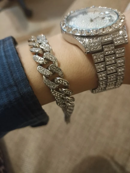 .часы и браслет очень красивые и качественные, все камушки на месте, очень ярко блестят. Ремешок на часах был широк, но убрали звенья и теперь в самый раз. Металл браслета тяжелый, что придает хороший вид. Все смотрится дорого и красиво.
