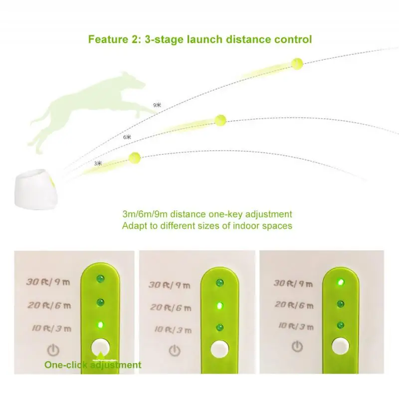 Регулируемое расстояние запуска: устройство для запуска мяча может запускать мяч на 10, 20 или 30 футов, который может быть легко изменен нажатием кнопки.