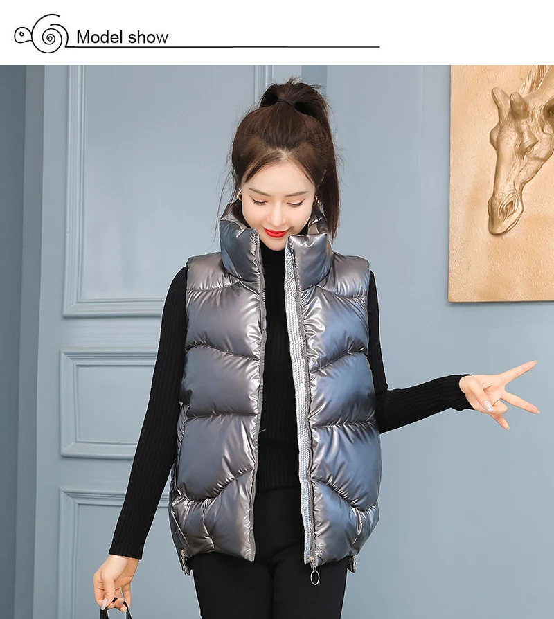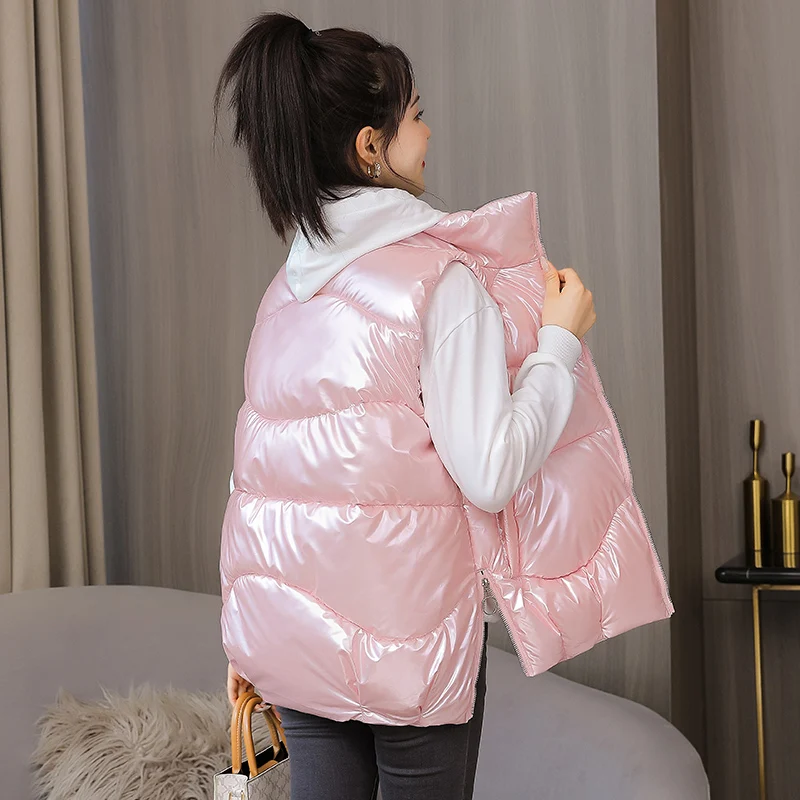 Зимний женский пуховой жилет с воротником-стойкой, Однотонный женский жилет с хлопковой подкладкой, глянцевая яркая куртка без рукавов для женщин