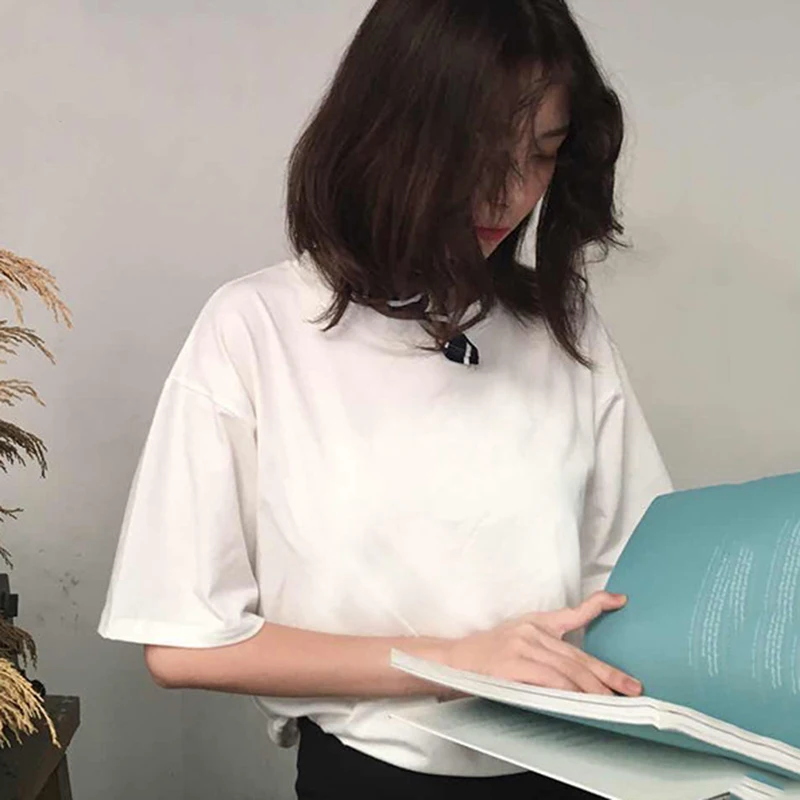 Футболка женская хлопковая оверсайз, базовая однотонная Повседневная Свободная рубашка в стиле Харадзюку, топ с круглым вырезом в Корейском стиле, на лето