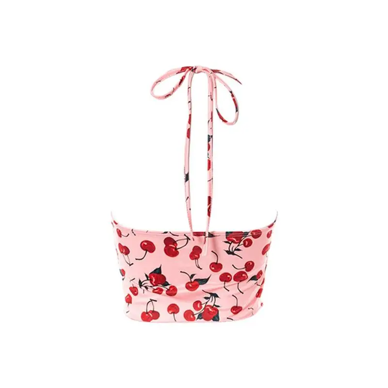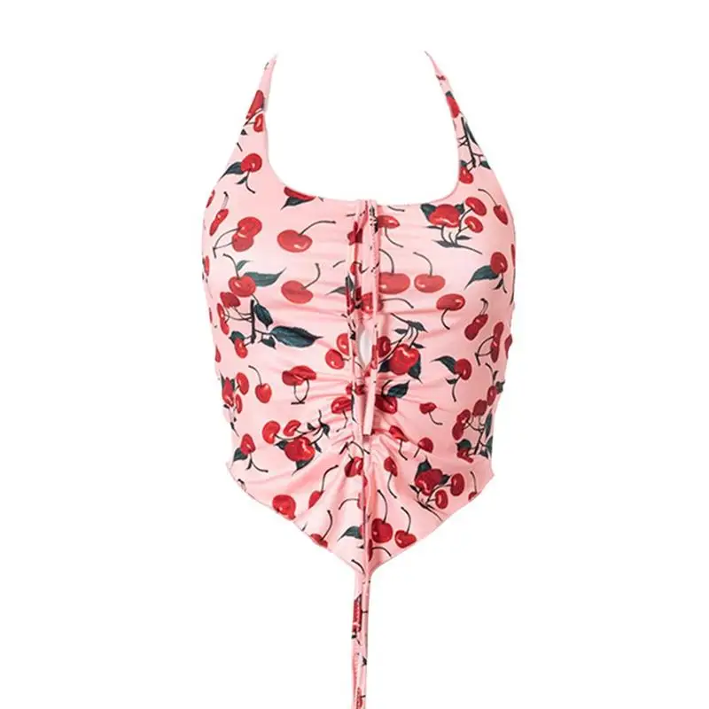 Укороченный топ с принтом вишни y2k, эстетичный топ с лямкой на шее, майка с рюшами и завязками, Женская винтажная толстовка, пляжный праздничный Топ, Майки 90-х