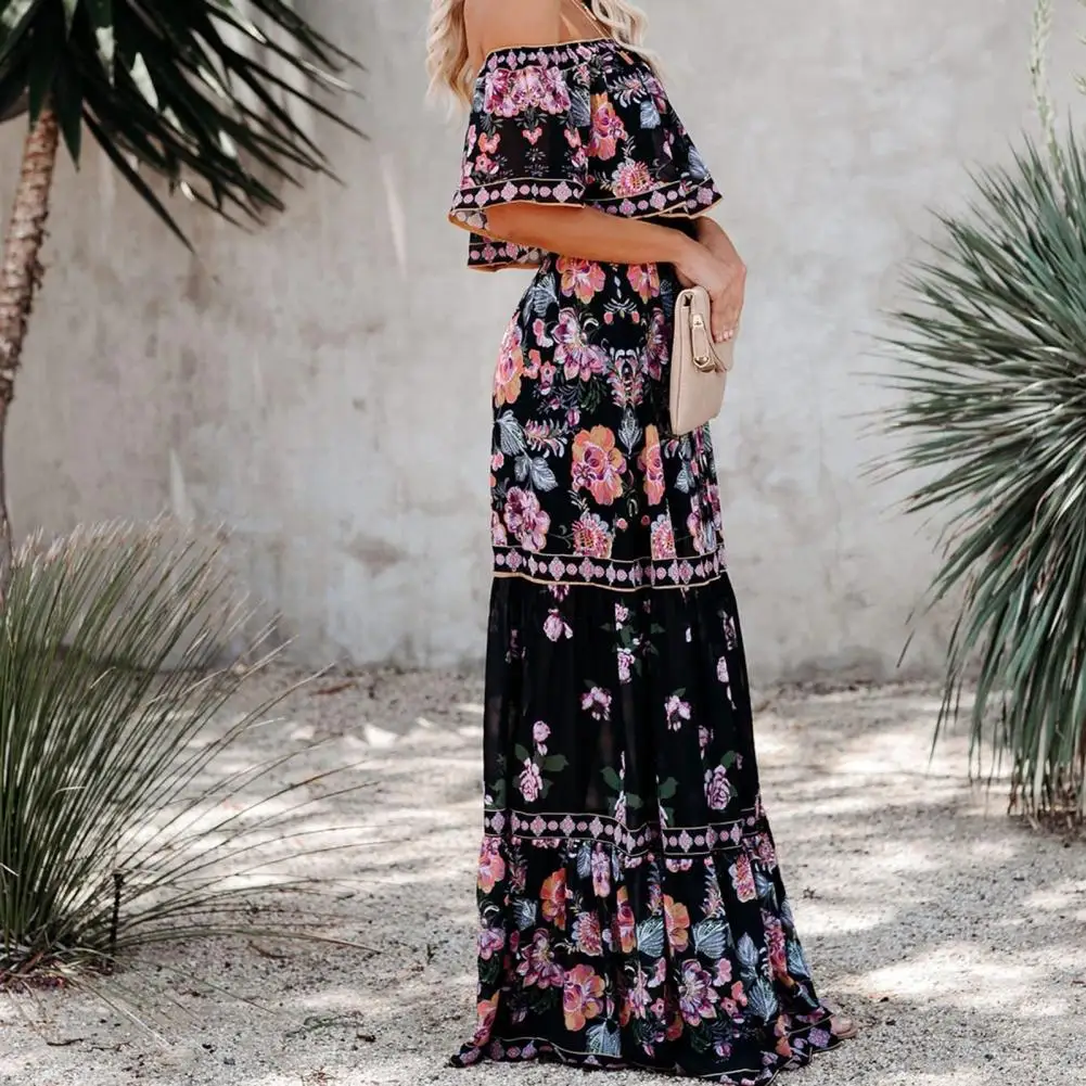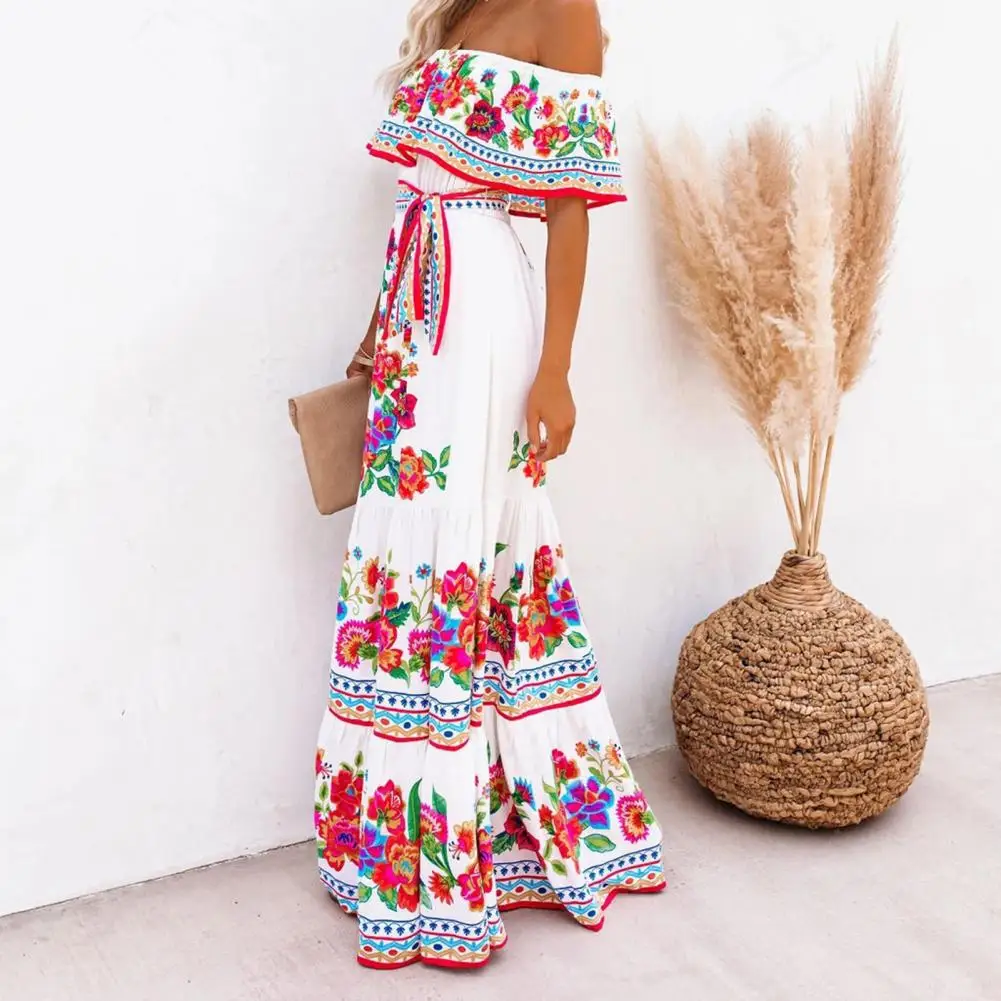 Лидер продаж 70%, летнее платье с цветочным принтом, женское Горизонтальное платье с высокой талией и плечами для вечерние