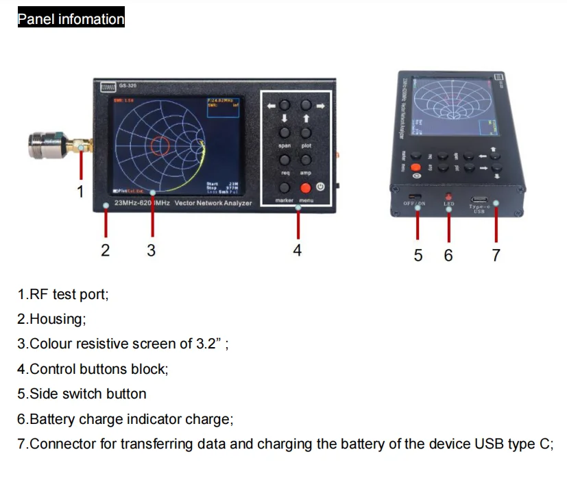 23-6200 МГц Портативный VNA SWR 6G векторный сетевой анализатор рефлектометр NanoVNA тип с 3,2 "сенсорный экран GS-320Описание:GS-320 портативный векторный сетевой анализатор VNA (рефлектометр) 23-6200 МГц предназначен для измерения соответствующих характеристик пассивного и активного радиооборудования (антенны, кабели, фильтры, аттенюаторы, усилители и т. д.).Это устройство позволяет измерять параметры сложного коэффициента отражения, коэффициента стоячей волны (VSWR), сопротивления, поглощения, амплитуды, фазы, потери и расстояния до точки повреждения кабеля.Представление о производительности:GS-320 изготовлен из прочного алюминиевого корпуса и принимает форму подвижного автоматического инструмента. Из-за легкого веса, компактной структуры и низкого энергопотребления, он может непосредственно измерять объект, который нужно измерить. Этот анализатор особенно подходит для компаний, занимающихся телекоммуникацией, установкой и обслуживанием антенн и усилением сотовой связи. С ним сервисные центры и обслуживающий персонал могут выполнять RF анализ кабелей и антенн во время ввода в эксплуатацию или технического обслуживания. Кроме того, это оборудование идеально подходит для мастерских, радио-энтузиастов, образовательных учреждений и лабораторий.Устройство имеет 3,2-дюймовый цветной резистивный сенсорный экран, который может отображать результаты измерений и управлять устройством. Например, вы можете использовать инструмент для выполнения следующих операций:-Используйте таблицу Smith для соответствия сопротивления-Измерьте соотношение стоящей волны-Измерьте затухание в кабеле-Измерение неисправностей кабеля или неправильных расстоянийПреимущества:-3,2 "цветной сенсорный экран, можно быстро настроить сканирования параметры и показать результаты измерений-Широкий диапазон рабочих частот: от 23 МГц до 6200 МГц-Скорость сканирования до 1000 точек/сек-Высокая точность измерения: 0,25 дБ и 1,5 ° во всем диапазоне частот-Возможность отображения до четырех независимых маркеров на всех диаграммах, так что измеренные параметры могут быть точно оценены-Отображение практически всех возможных описаний коэффициента отражения-Измерьте неисправность кабеля и расстояние потери-Поддержка хост-компьютера, может управляться через интерфейс ПК (свяжитесь с нами для программного обеспечения хост-компьютера)-Светильник вес, маленький размер; Вес: 300 г, размер продукта: 145 × 72 × 24 мм-Встроенный аккумулятор может обеспечить до 4 часов работы от батареи-Питание устройства от планшета или смартфона через usb-кабель типа C. Батареи, которые не разряжаются во времени, не остановят рабочий процессХарактеристики:-Диапазон рабочих частот: 23-6200 МГц-Разрешение частоты: 10 кГц-Максимальное количество точек сканирования: 1000-Скорость сканирования: 1000 точек/сек-Направление моста, без корректировки во всем диапазоне: > 12 дБ-Эффективная направленность (после полной калибровки одного порта) (примечание 1): > 50 дБ-Отношение стоящей волны на входе: <2-Точность измерения фазы (примечание 1): > 1,50Амплитуда точность измерений (примечание 1): > 0,25 дБ-Определить разрешение расстояния до точки неисправности (примечание 2): (C x VF) / 2S m-Максимальная длина измерительного кабеля (примечание 3): 3000 м (VF = 1)-Максимальное входное напряжение постоянного тока: 25 в-Отображение диаграммы: диаграмма Смита; Поля