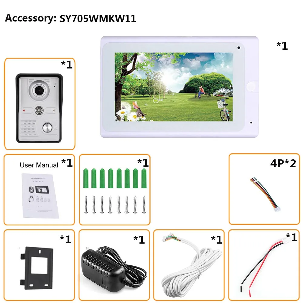 1 * внутренний монитор 1 * наружный блок 1*15V/1.2A Питание 1 * 4-ядерный провод с клеммой сечением (5 м) 1 * провод для разблокировки 1 * Руководство 1 * Монтажная пластина 1 * винты 1 * цветная посылка