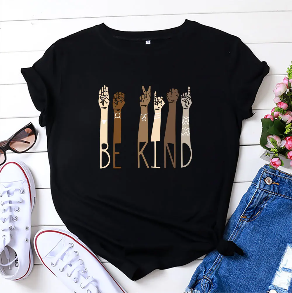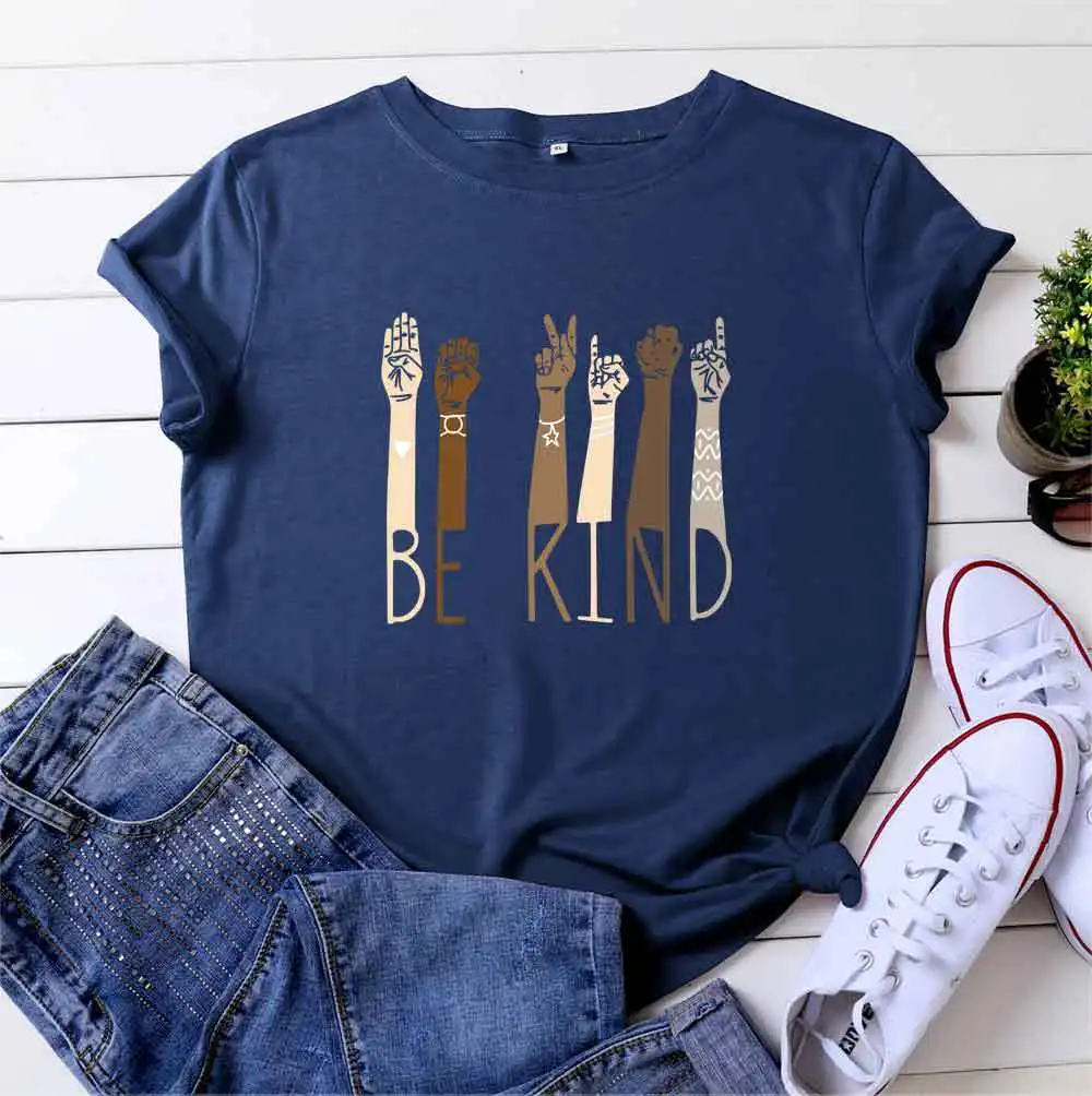 Футболка женская оверсайз с коротким рукавом, базовый топ из 100% хлопка с принтом жестов стиле Be Kind, с круглым вырезом, на лето