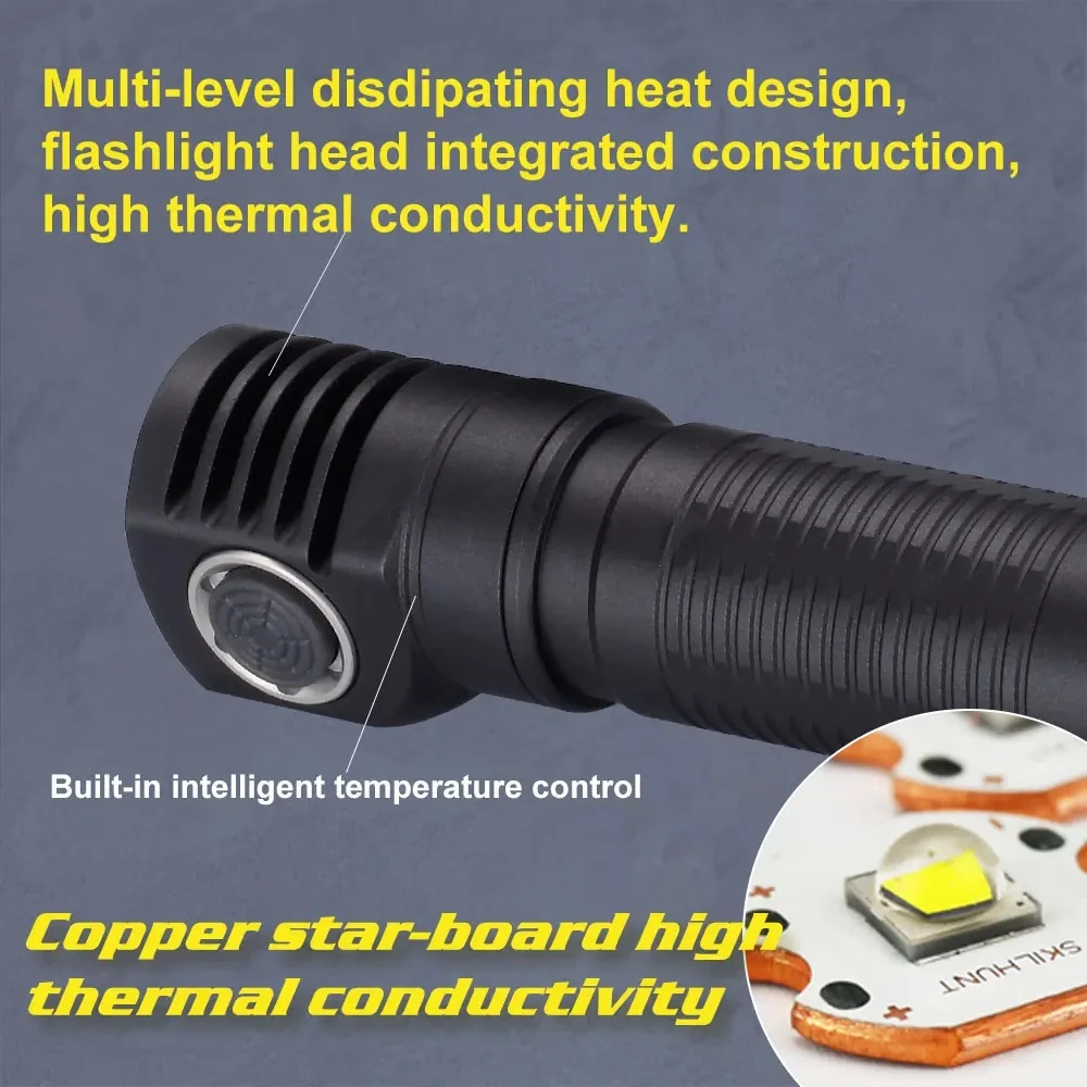 4. Многоуровневое Рассеивающее тепло и новый медный правый борт, отличное рассеивание тепла. Головка фонарика интегрированная конструкция, высокая теплопроводность.