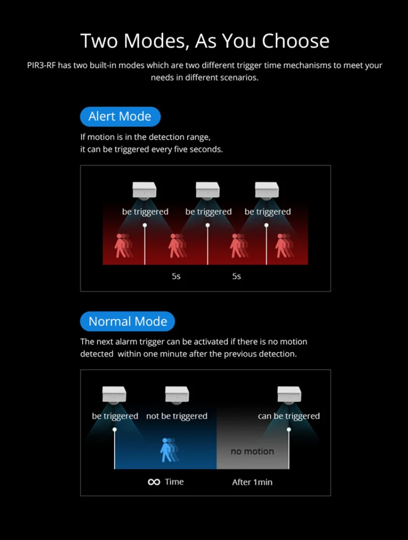 PIR3-RF имеет 2 рабочих режима, которые оповещают и нормальный режим. В режиме оповещения датчик срабатывает в 5s, когда кто-то входит в диапазон обнаружения. В нормальном режиме, следующий предупреждающий триггер активируется, если нет движения, обнаруженного в течение 1 мин после предыдущего обнаружения.