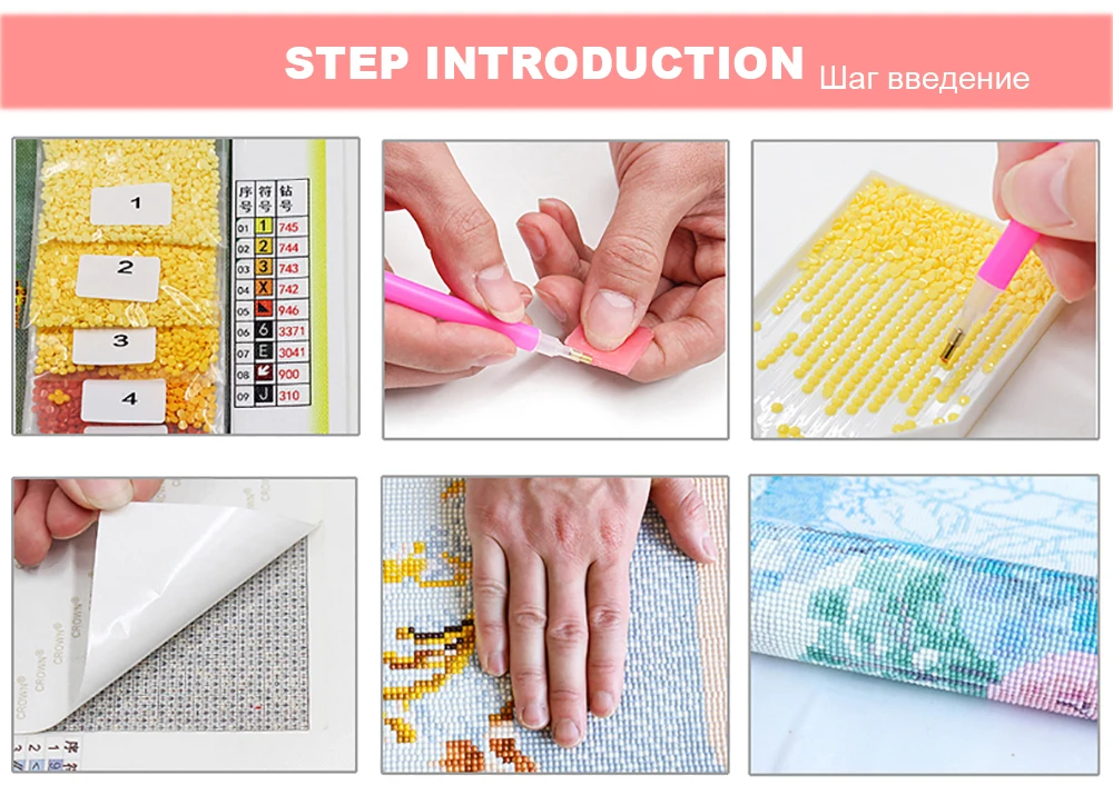 1: Откройте свою посылку, проверьте комплекты, все ли детали завершены или нет.2: Проверьте Цвет алмазов из смолы и соответствующий цветовой код.3: Выберите символ (символ), найдите соответствующие алмазы.4: Используйте ручку, чтобы забрать алмаз, поместите его в соответствующее положение.5: после завершения слегка прижмите бриллианты рукой, чтобы крепко прикрепить их.