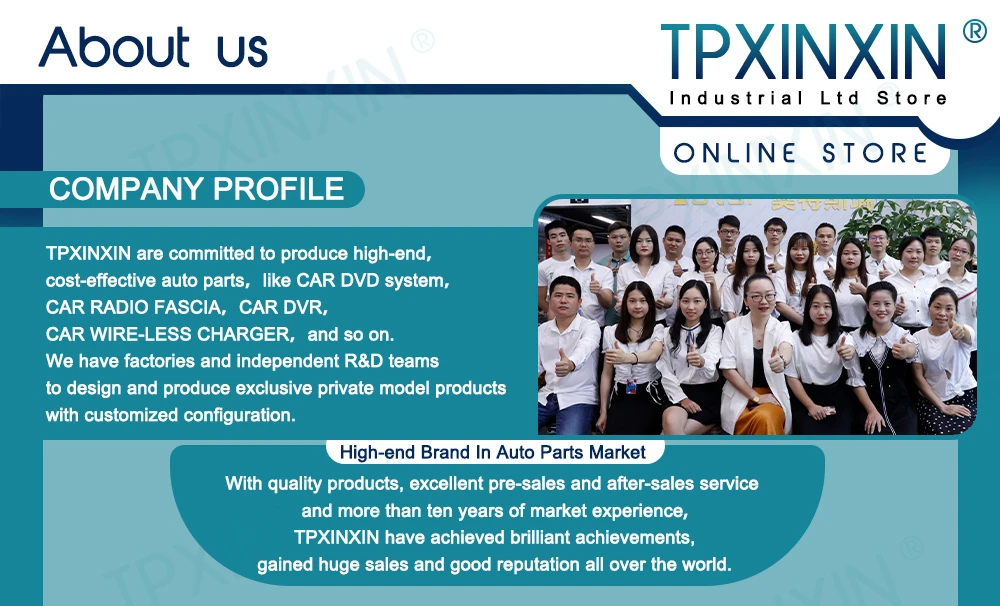 Высококачественный бренд на рынке автозапчастейTPXINXIN стремятся производить высококачественные и Экономичные автозапчасти, например, автомобильные DVD-системы, автомобильные радиоприемники. Автомобильный видеорегистратор. Автомобильное беспроводное зарядное устройство. И так далее. Мы имеем factoriesand независимые R & D команды для того чтобы конструировать и произвести Эксклюзивные частные продукты модели с индивидуальной конфигурацией.