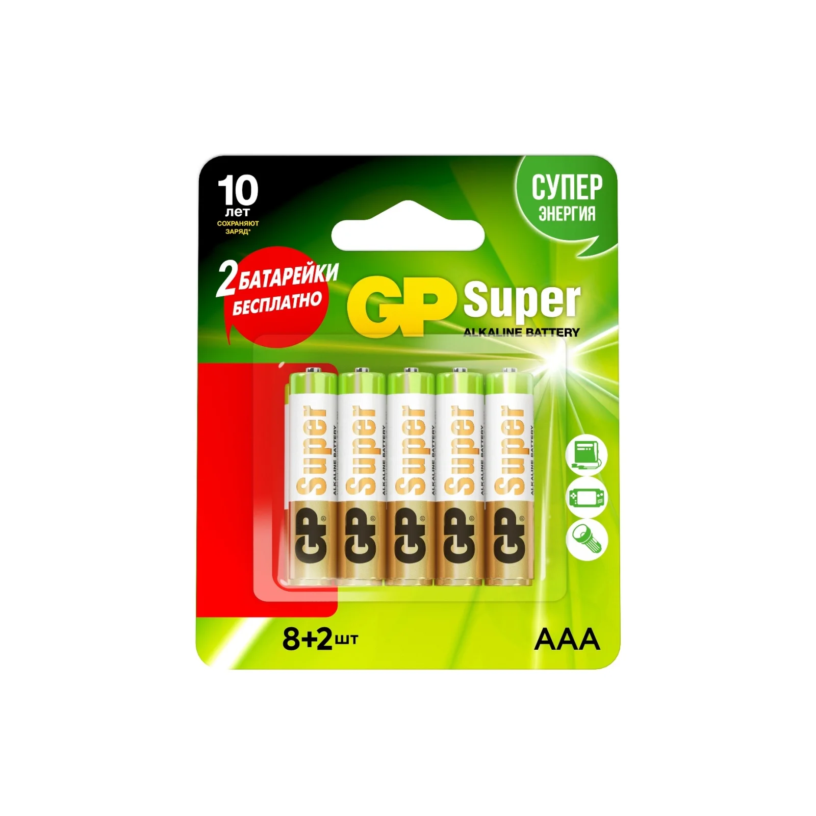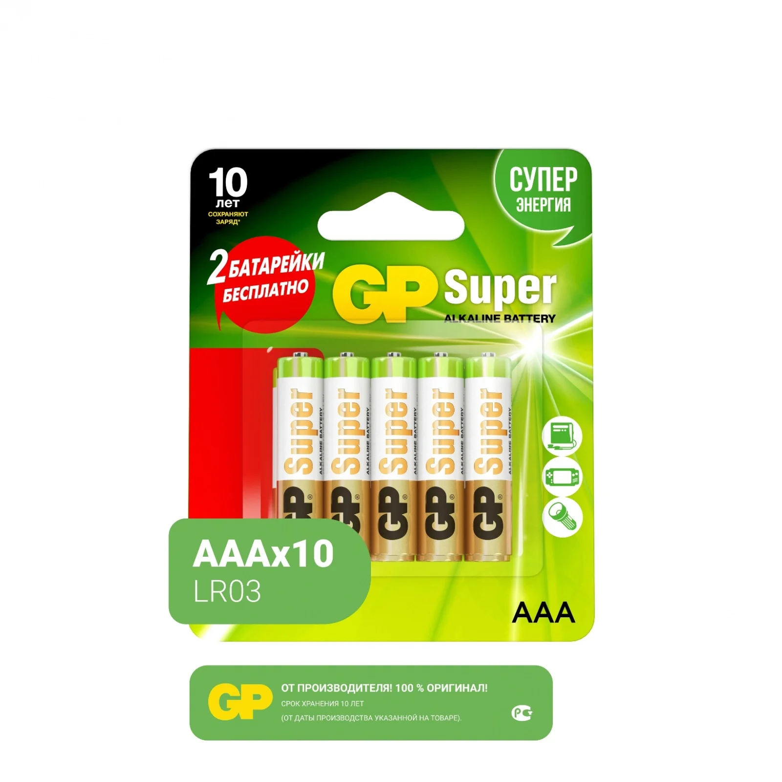 Комплект из 10-ти алкалиновых батареек GP типоразмера ААА позволит решить проблему с источниками питания в путешествиях, в бытовых условиях, на даче. Будет полезен там, где используется большое количество приборов с повышенным энергопотреблением. Батареи подходят для использования в портативных радиоприемниках или радиостанциях, в осветительных приборах, игрушках с электронными элементами. Комплект источников питания GP является идеальным по соотношению «цена/качество».