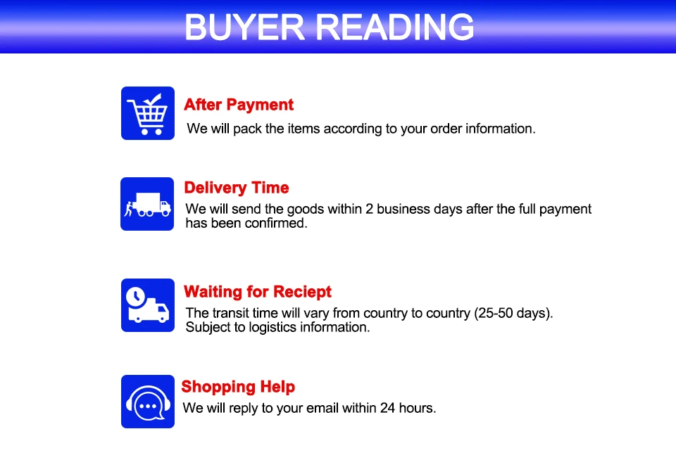 Теплые Примечания:1. Пожалуйста, полностью зарядите аккумулятор перед первым использованием.2. Если вы не собираетесь использовать аккумулятор в течение месяца или дольше, храните его в чистом, сухом, прохладном месте вдали от огня и воды.3. Пожалуйста, Перезарядите его после длительного хранения. Поскольку Ni-Cd/Ni-mh и литий-ионные аккумуляторы будут саморазряжаться во время хранения.4. Не Разделяйте, не выдавливайте и Не ударяйте.5. Если товар неисправен, пожалуйста, сообщите нам в течение 7 дней после его получения.6. Как правило, мы отправляем товары в течение 2-3 рабочих дней после завершения оплаты. Как правило, после отправки Экспресс-система занимает 7-10 рабочих дней для обновления номера отслеживания в систему. В основном посылка может быть доставлена в течение 6 недель. Если вы не получили свою посылку вовремя, пожалуйста, сообщите нам, мы Отследим посылку