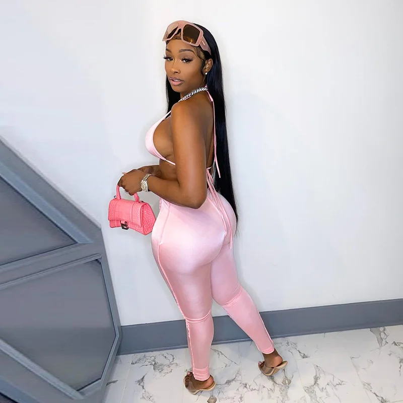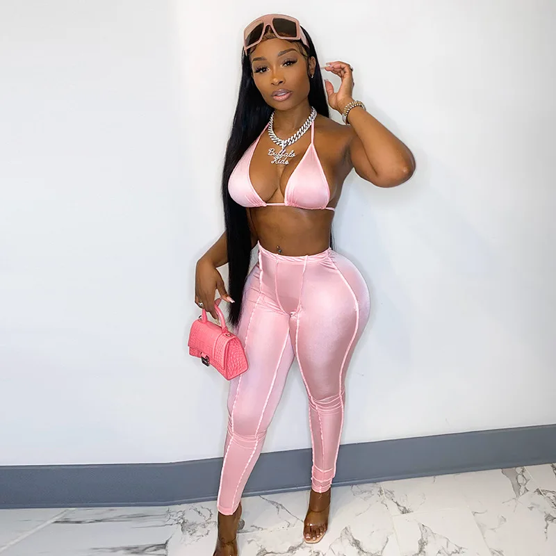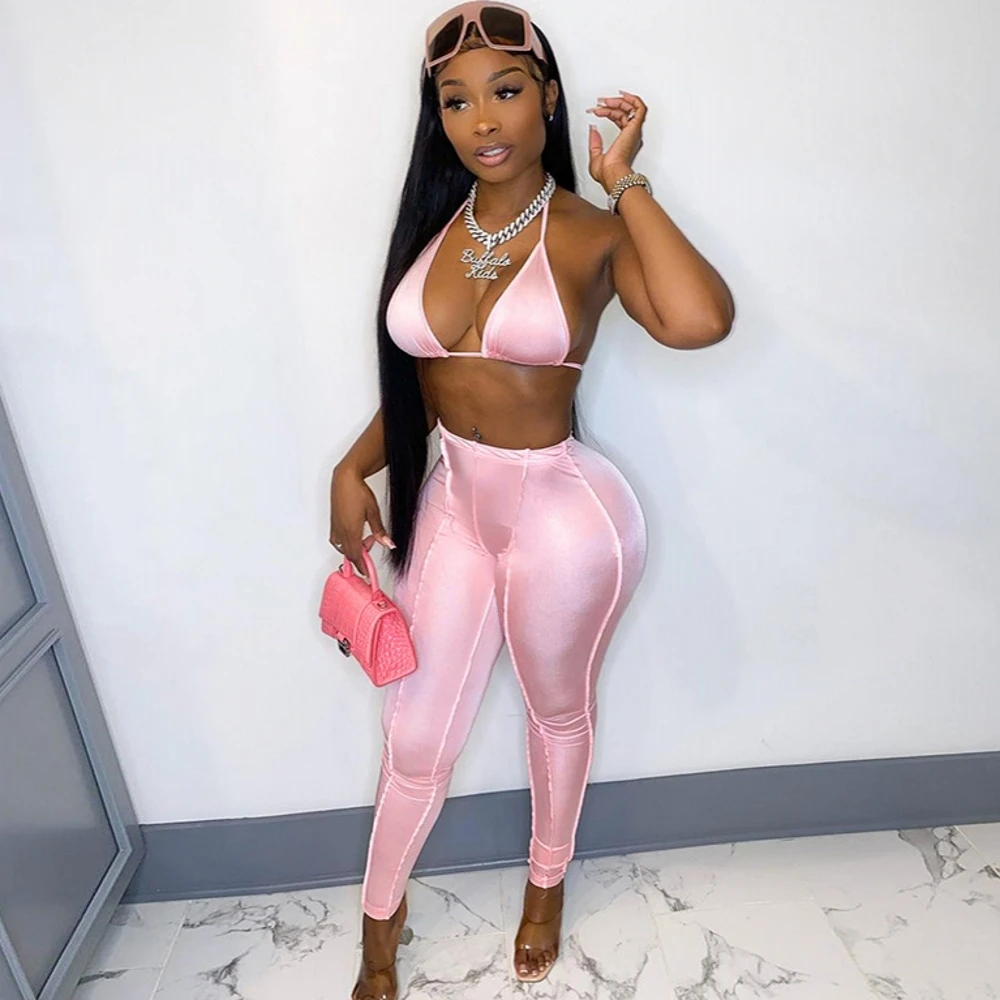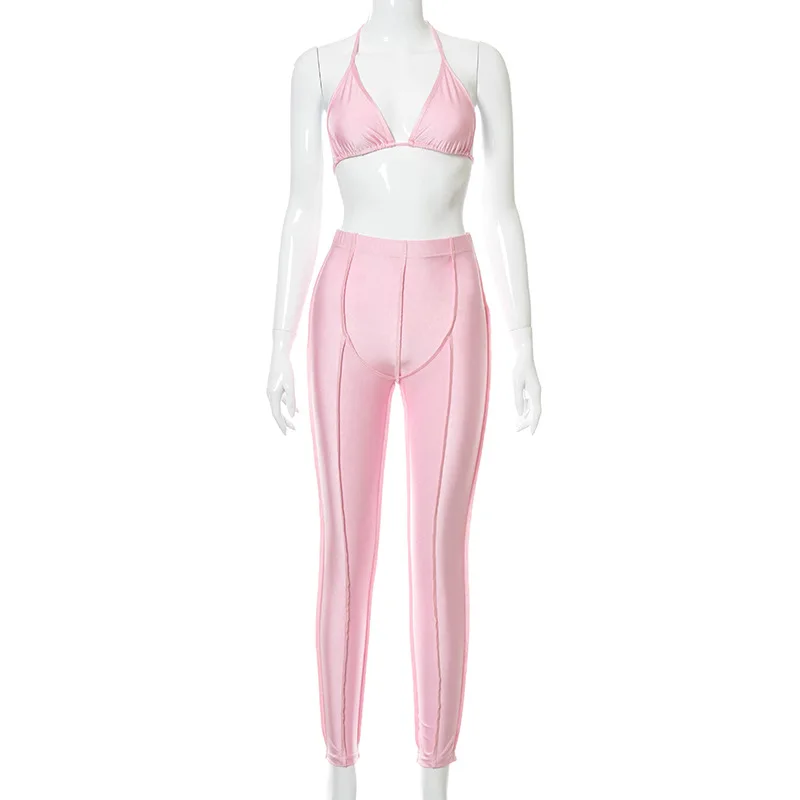 Уличные сексуальные бандажные Розовые Костюмы Y2K 2021, модный топ на шнуровке и расклешенные брюки с высокой талией, комплект из 2 предметов