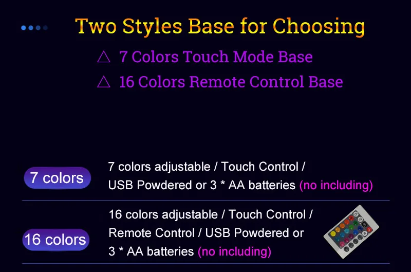 * 7 цветов автоматически изменяет цвет с помощью сенсорного переключателя. Нажмите сенсорную кнопку, чтобы сохранить цвет, затем нажмите его снова, режим автоматического изменения цвета работает.* 16 цветовых режимов с сенсорным кнопочным переключателем и пультом дистанционного управления. Может управлять светильник как с помощью сенсорной кнопки, так и с помощью пульта дистанционного управления.