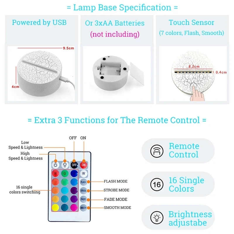 Спецификация-Тип изделия: 3D светодиодный ночной Светильник-Основной Материал: АБС-пластик-Светильник Материал направляющей пластины: акрил-Процесс: лазерная гравировка-Режим питания: USB или аккумулятор (батарея в комплект не входит)-Входное напряжение: 5 в пост. Тока-Источник: светодиодный светильник-Светильник: 7 цветов или 16 цветов-Светильник: 3D стереоскопический рисунок (как показано на фотографии)-Режим переключения: сенсорный выключатель/сенсорный выключатель + пульт дистанционного управления-Напряжение продукта: 5 В-Мощность продукта: 3 ВтПосылка в том числе7 видов цветов Пульт дистанционного управления (пульт дистанционного управления в комплект не входит): 1 акриловая пластина1 основание1 х USB кабель1 Инструкция на английском языке 16 Цвет пульт дистанционного управления (с Дистанционный пульт):1 акриловая пластина1 основание1 х USB кабель1 х пульт дистанционного управления1 Инструкция на английском языке